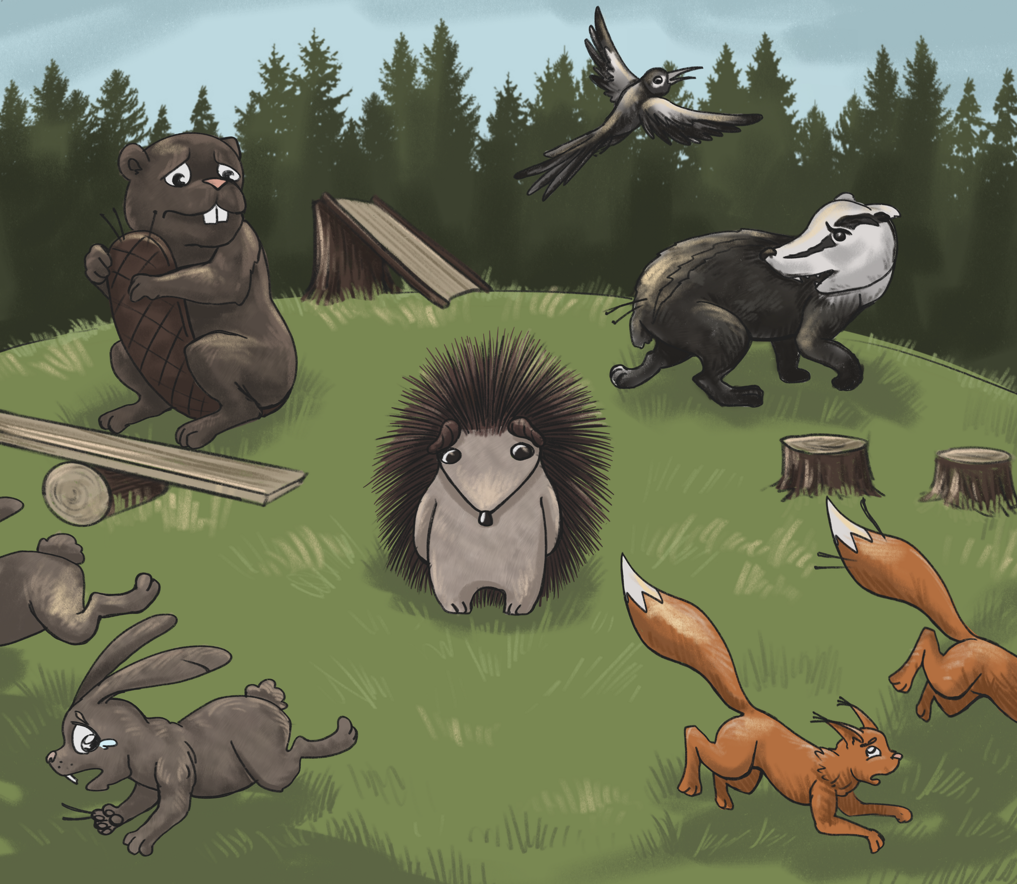 — Они сказали, что я слишком колючий, — ответил Грампи и нахмурился ещё сильнее. — Зайчата хотели поиграть со мной, но укололись об иголки и заплакали. Барсучата хотели сыграть со мной в догонялки, но тоже поранились. И белки, и соловьи, и даже дети жука-носорога — все убегали от меня в слезах. С тех пор я понял, что никому не нужен, и остался совсем один.