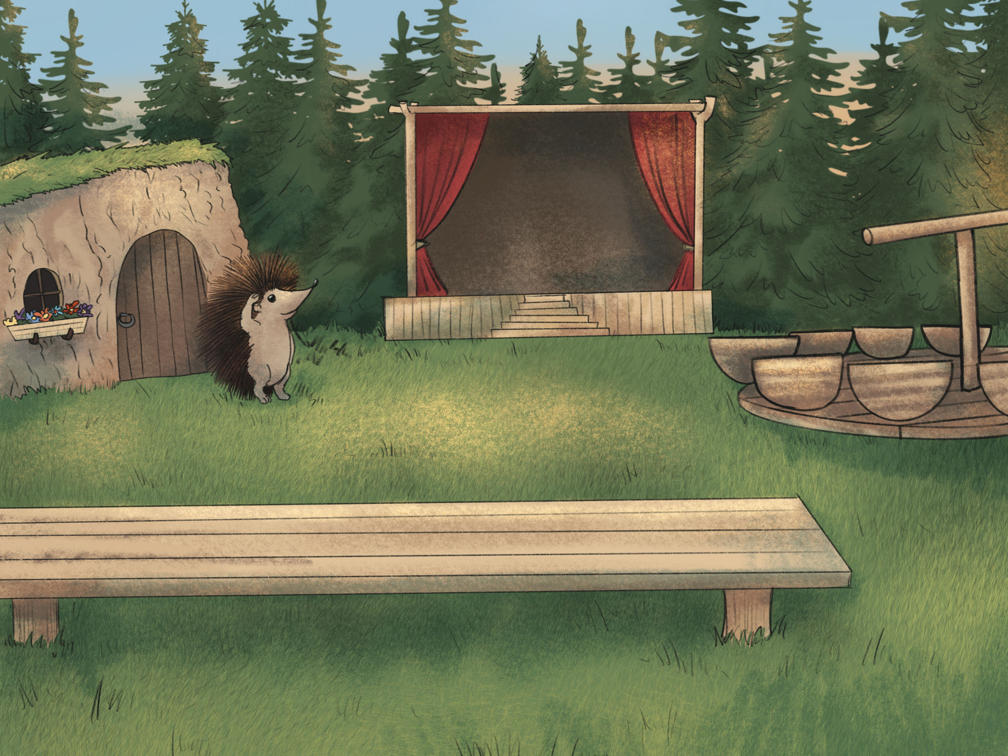 Мышки с восторгом посмотрели на Грампи. Нахмурив решительно брови, колючий ёж направился в сторону сцены, по дороге здороваясь со всеми животными на поляне.