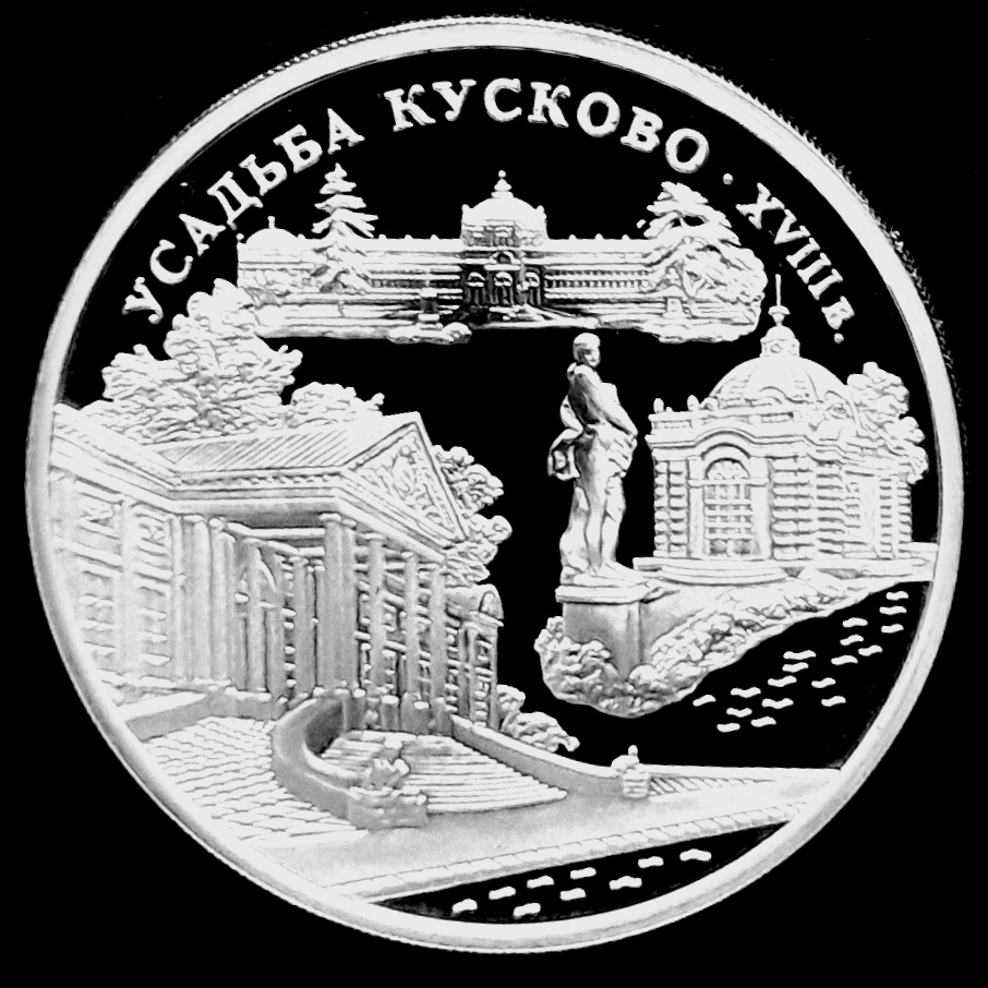 Эта монета выпущена в 1999 году в рамках серии "Памятники архитектуры России". На монете изображение памятников архитектуры усадьбы Кусково: дворец, белокаменная скульптура, павильон "Грот", павильон "Оранжерея".