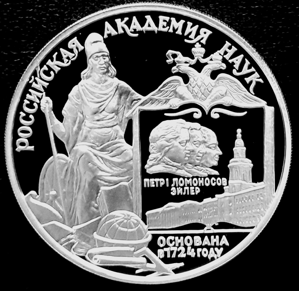 Эта монета выпущена в 1999 году к 275-летию Российской академии наук. На монете изображение богини мудрости Минервы - покровительницы наук, ремёсел, искусств и мирного труда. Раскрытая книга, на страницах которой профили основателя Академии наук Петра I и учёных с надписями: "ПЕТР I ЭЙЛЕР ЛОМОНОСОВ", здания Академии наук, двуглавый орёл, увенчанный короной.