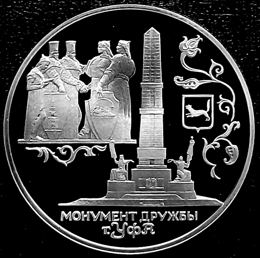 Эта монета выпущена в 1999 году. На монете изображены монумент Дружбы, фрагмент монумента, герб города Уфы.
