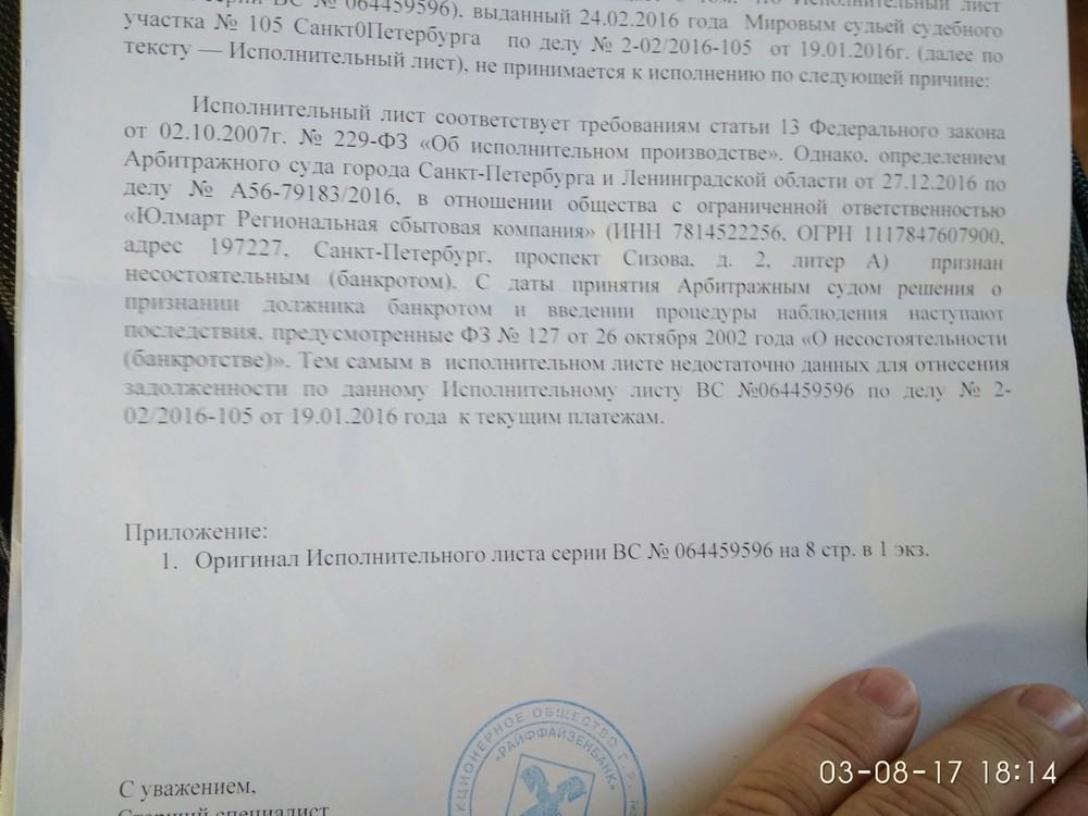 Поди-знай. Однако определением арбитражного суда Питера от 27.12.2016 по делу А56-79183/2016 ООО "Юлмарт РСК" признан несостоятельным (банкротом).