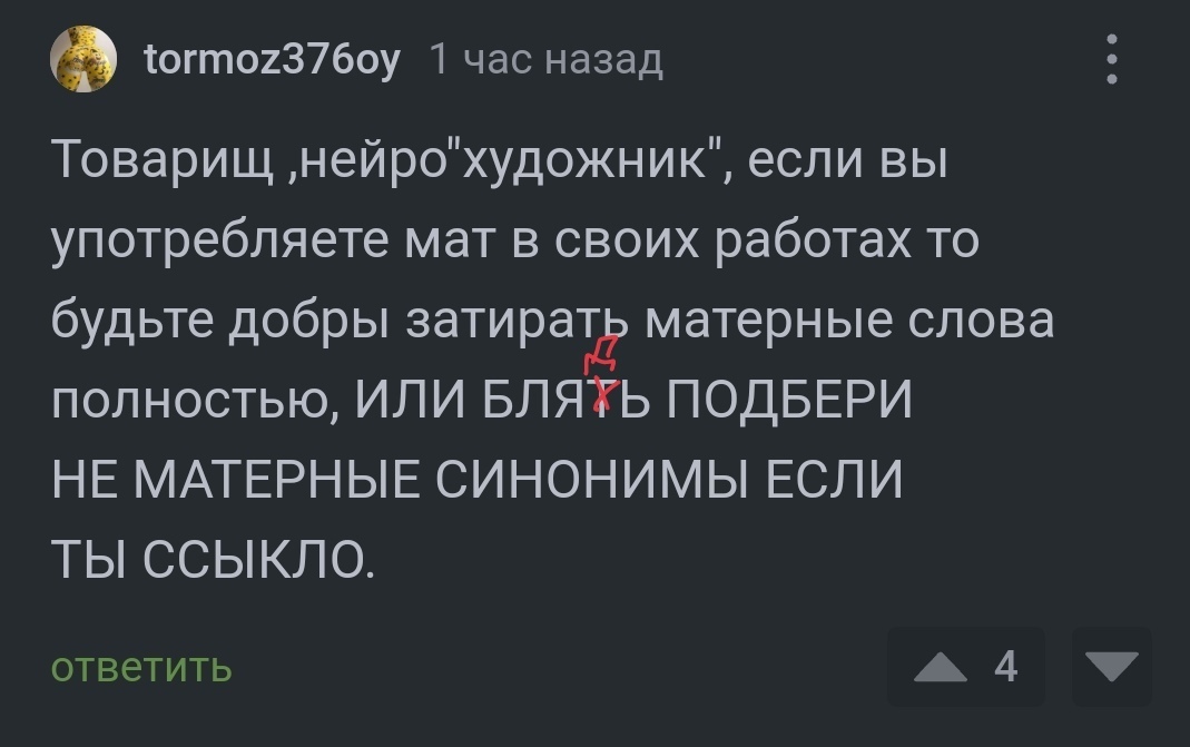 Товарищ ,нейро"художник", если вы употребляете мат в своих работах то будьте добры затирать матерные слова полностью, ИЛИ БЛЯТЬ ПОДБЕРИ НЕ МАТЕРНЫЕ СИНОНИМЫ ЕСЛИ ТЫ ССЫКЛО.