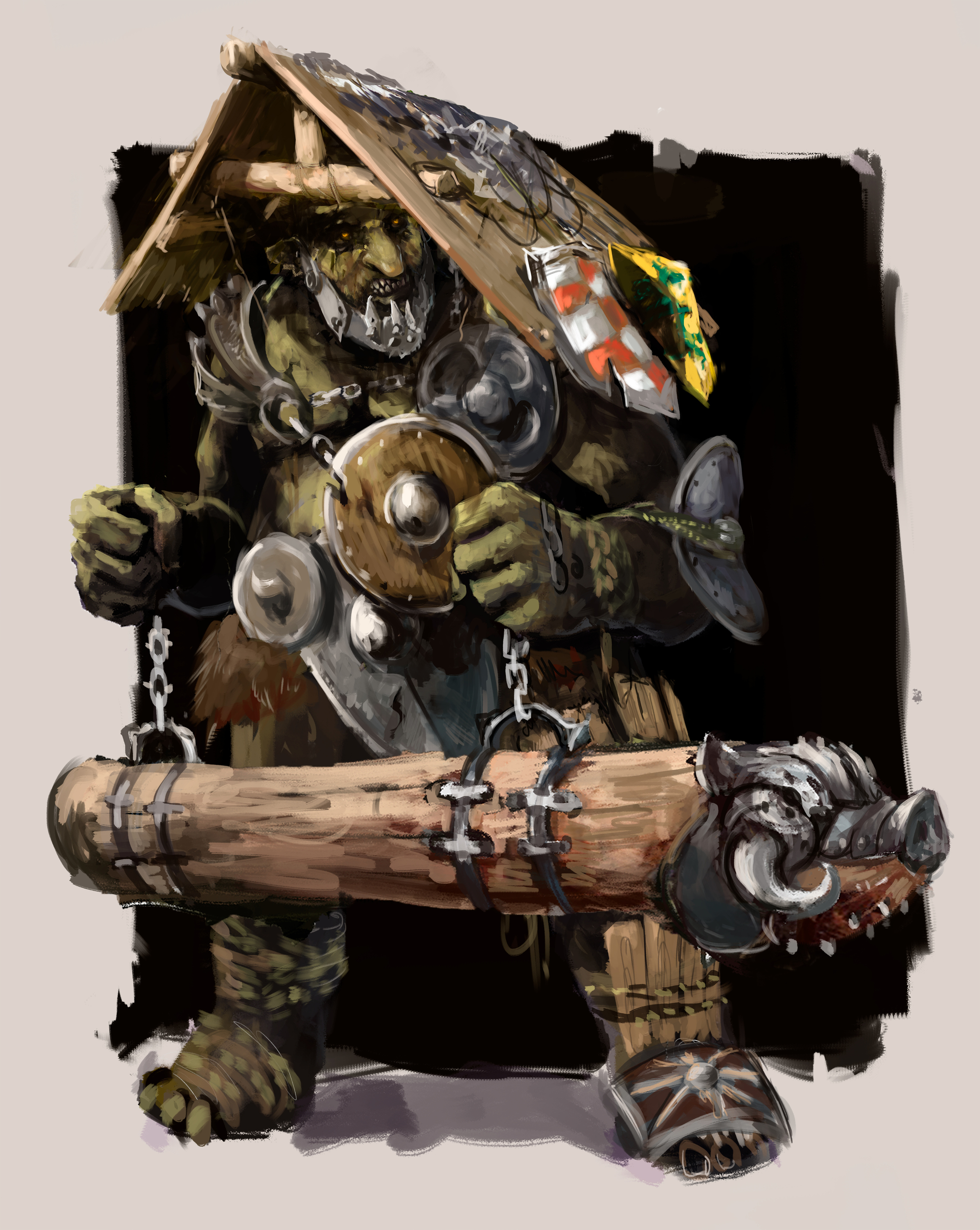 Начнем с концепт-арта. По нашей задумке один из высокоуровневых юнитов ветки поддержки Племен зеленокожих будет троллем, который использует в качестве оружия ничто иное, как таран! Вы можете увидеть, как менялся образ в процессе проработки деталей и что мы использовали, как референсы.