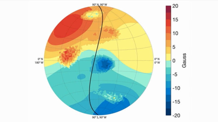 Синими участками на картинке обозначены области, где поле оказалось слабее ожидаемого, красными – где сильнее. Черная линия – ожидаемая мощность. Неравномерность магнитного поля может говорить о том, что планетарное динамо расположено выше зоны металлического водорода, в зоне молекулярного водорода.