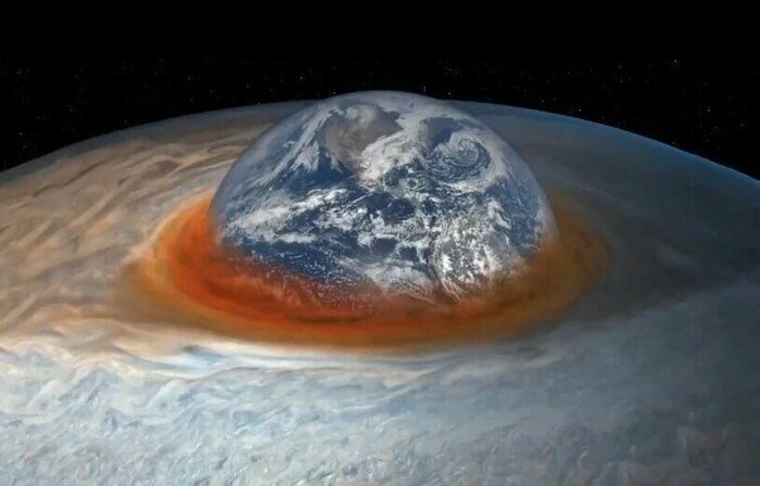 Совмещение фотографий газового гиганта и нашей планеты тоже помогает представить, насколько он велик: