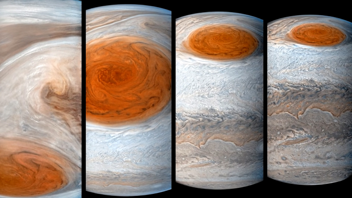 Станция зафиксировала также горячие пятна вдоль экватора и передала множество снимков Большого Красного Пятна крупным планом: