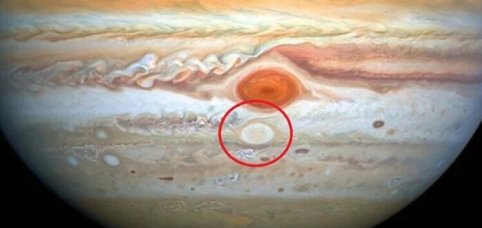 Ниже Большого красного пятна есть другой шторм, именуемый как Овал ВА. Он намного моложе и меньше большого пятна. По наблюдениям ученых, этот шторм образовался в 1998-е году, в ходе слияния трех других бурь (три белых пятна), которые бушевали на Юпитере около 60 лет: