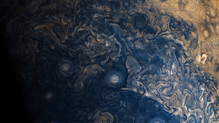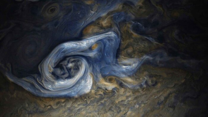 Также «Юнона» подтвердила, что вихри и воронки способны длительное время сохранять свою форму, нашла вихри со сложной структурой, как, например, этот шторм в северном полушарии: