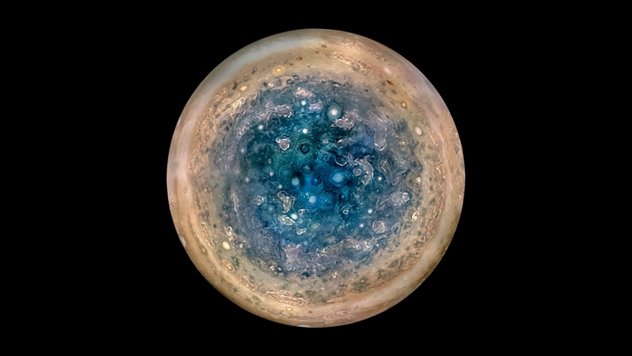 Но вернемся к науке. Впервые ученые получили возможность рассмотреть полюса Юпитера. Как выяснилось, они выглядят, совершенно иначе, чем остальная поверхность планеты: вместо ровных разноцветных полос облаков видны закрученные вихри, спирали и воронки:
