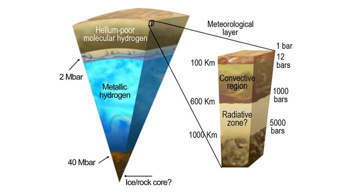 Под облаками водород и гелий, сжимаемые огромным давлением, начинают переходить в экзотические жидкие формы. Этот материал ведет себя как твердое тело - он вращается с равномерной скоростью, подобно динамо, и именно он генерирует мощнейшее магнитное поле планеты.