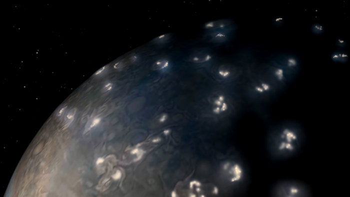 Грозовые вспышки на Юпитере. Фото "Юноны", с компьютерной обработкой.