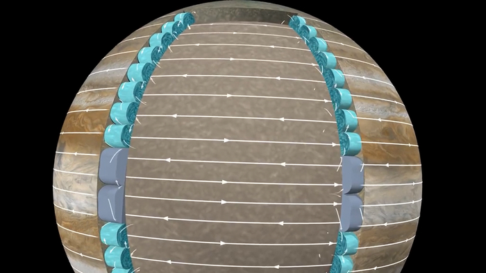 Циркуляция атмосферных течению Юпитера. Кадр с канала "KOSMO".