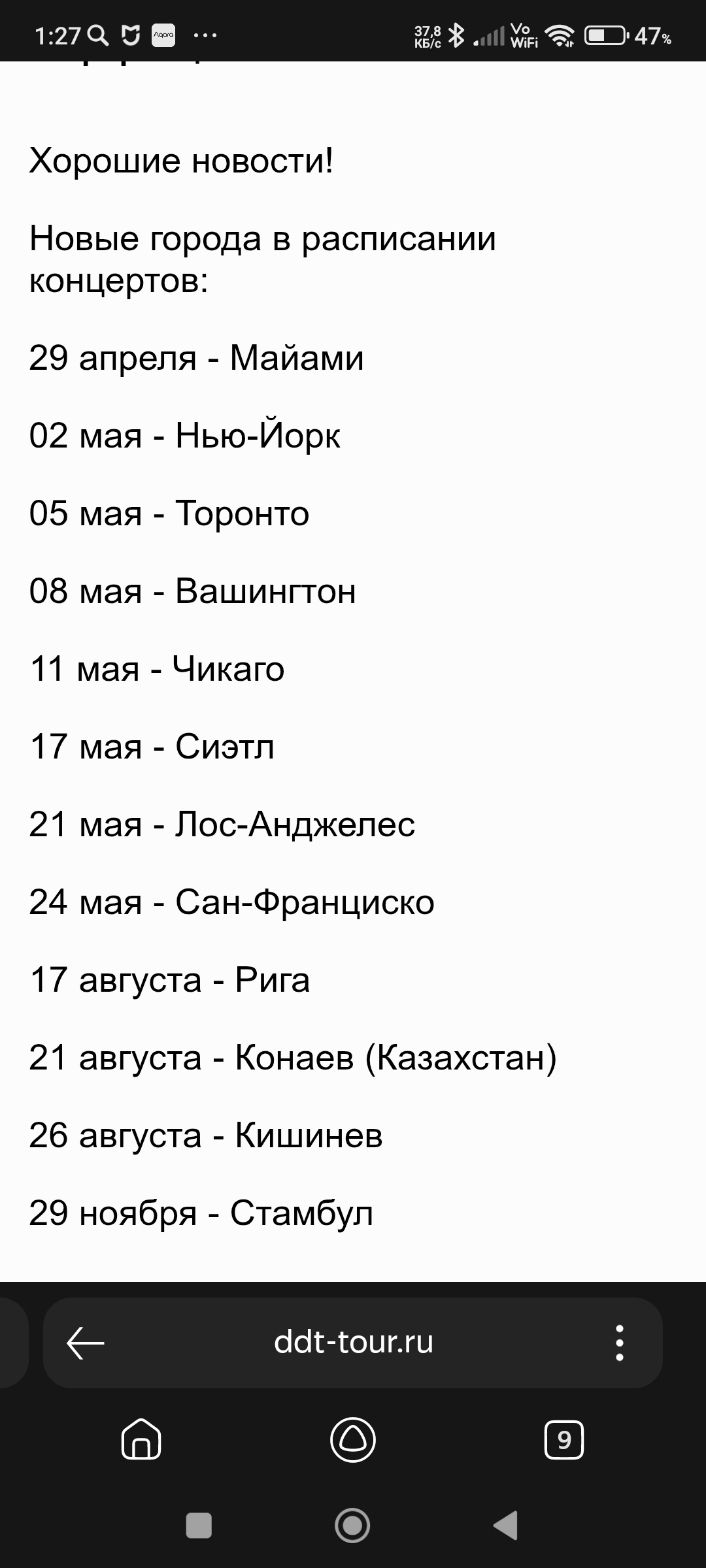 Сейчас пришел от соседей, после возлияния пива в свой организм. Решил послушать ДДТ - душа возжелала. Люблю эту группу с 13 лет, т.е. уже лет 30, и вдруг подумалось, а не сгонять ли мне на концерт Шевчука... Глянул на их сайте, а там пиздец расписание. Америка, Казахстан, Молдова, Турция... Какого хуя, Юра??? Это, разочарование полное! Вернись на родину, пой для русских фанатов. Нехер заграничных развлекать, а то помрешь, а я так и не схожу на твой концерт.