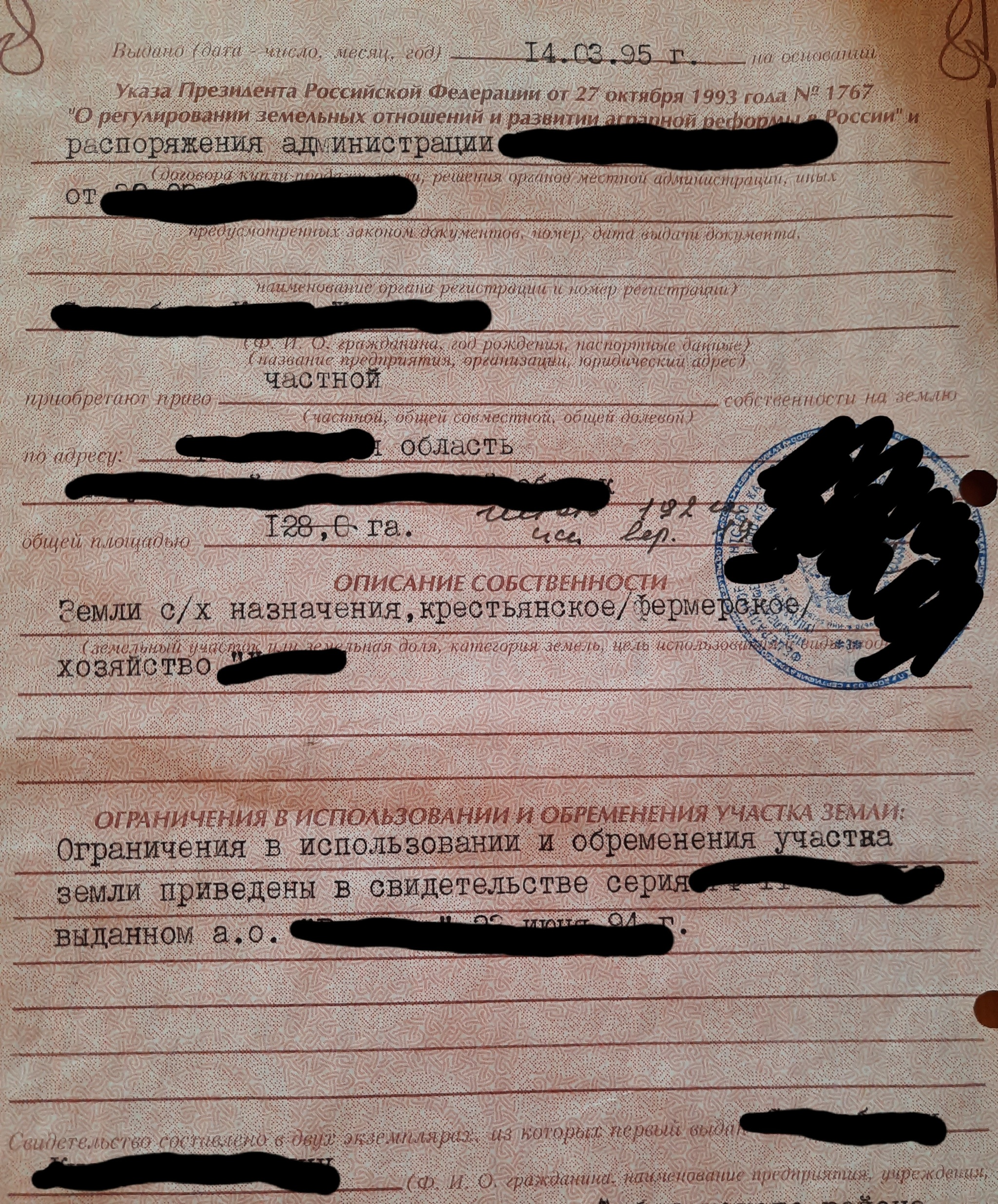 Добрый день! Ситуация такая. Пару лет назад в документах нашёл "свидетельство на права собственности на землю" от 1995 года и распоряжение о предоставление земельных участков для организации КФХ(крестьянского фермерского хозяйства) от 1994 года, но подумав, что землю изъяли в фонд государства из-за непользования убрал документы в длинный ящик. Недавно ездил на малую родину, и сходил в кадастровый. Там сказали, что земли никто не может изъять из КФХ.