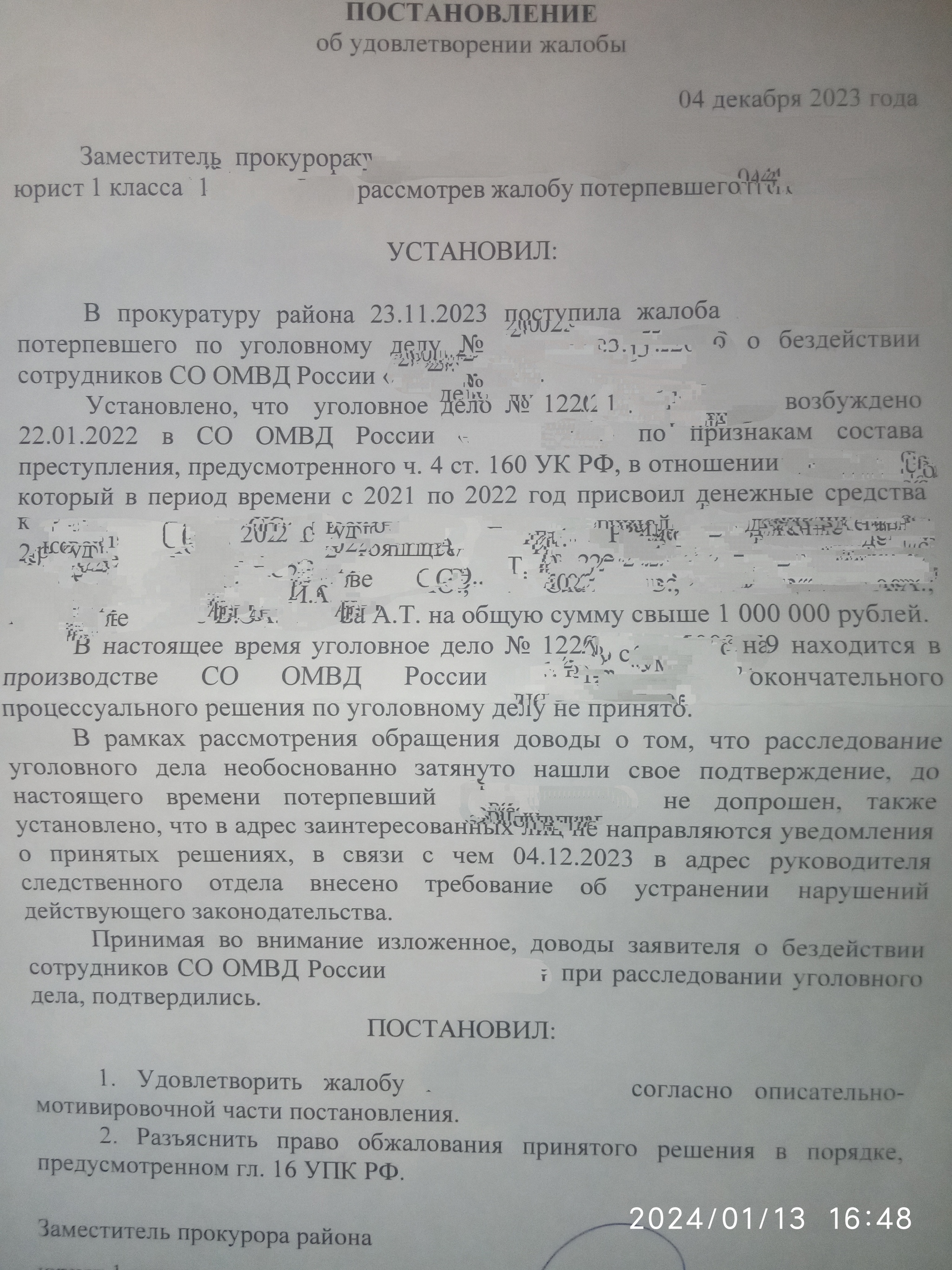 В 22м году умудрился я вляпаться в историю со строительством. Как результат потерял деньги. На чудо строителя, возбуждено уголовное дело по ст.160 ч.4. На данный момент я почти признан потерпевшим. Почему почти? Постановление/определение/решение в глаза не видел, но прокуратура в ответ на жалобу указала меня потерпевшим в своём постановлении о бездействии следователя в декабре 23го года. Как и других 13 человек (думаю там история та же). По факту дело висит. Второй год. Есть подозрения, в мат.заинтересованности следователя и возможно прокуратуры. За два года думаю можно было его закрыть.