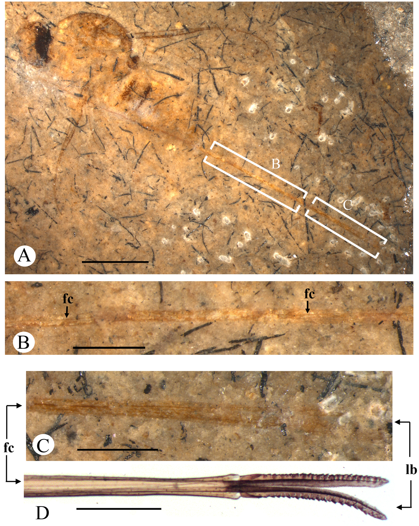 Детали строения хоботка мухи-шаровки A. kovalevi из верхней юры Казахстана. А — общий вид, B — участок хоботка, С — вершина хоботка, D — вершина хоботка современной мухи-шаровки Megalybus crassus. fc — пищевой канал, lb — лабеллумы (части хоботка). Длина масштабного отрезка — 2 мм (A), 0,5 мм (B–D). Изображение из статьи A. V. Khramov, E. D. Lukashevich, 2019. A Jurassic dipteran pollinator with an extremely long proboscis