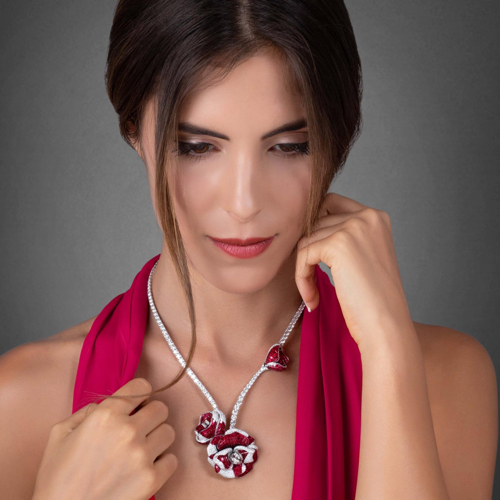 Обладая таким обилием интригующих подтекстов, Анна Страрости (Anna Strarosti), главный дизайнер Stenzhorn, решила воплотить три самых универсальных атрибута богатства, романтики и сострадания в трио цветов, помещенных в поток градуированных бриллиантов, образующих V-образную форму на шее. Центральный цветок в полном цветении представляет собой богатство с его восемью лепестками, которые великолепно украшают рубины и бриллианты. Цветок рядом с ним напоминает о сострадании, а молодой бутон олицетворяет романтику Пионы в порыве юности.
