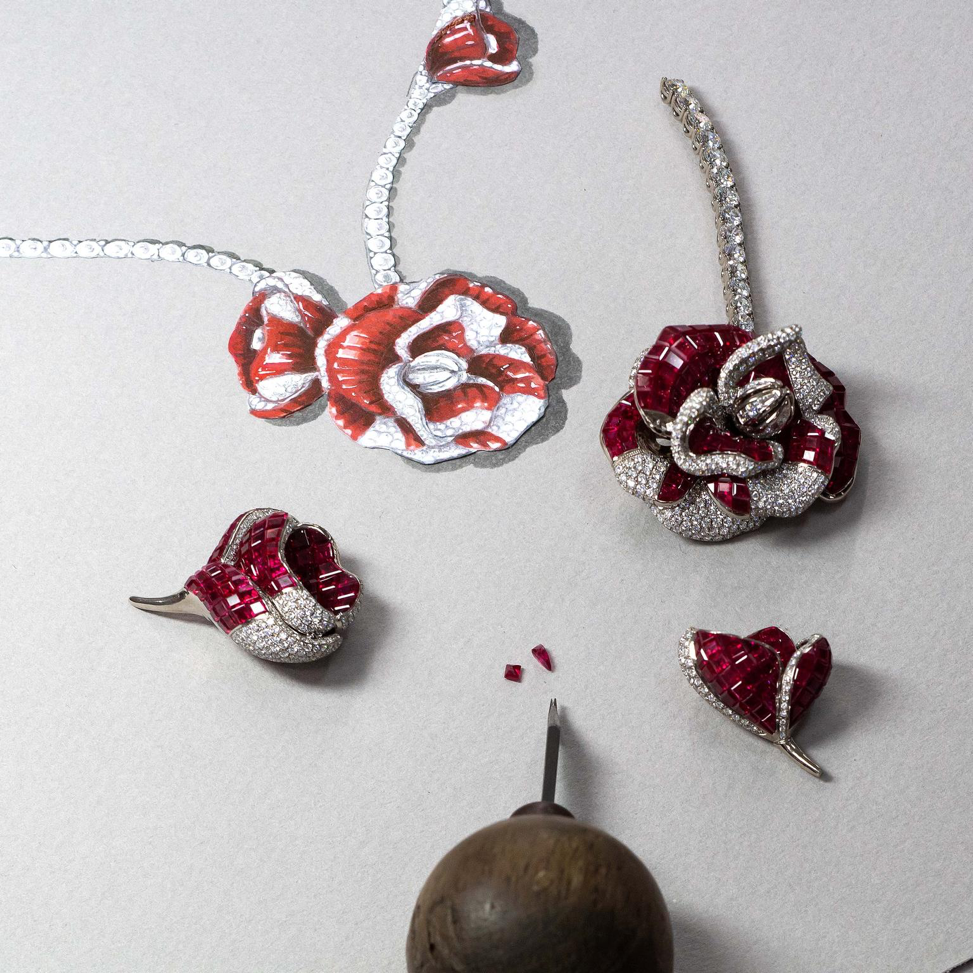 Пионы оживают благодаря умению Stenzhorn сочетать техники закрепки с большим мастерством, для создания этого украшения было использовано 25 карат лучших темно-розовых бирманских рубинов и 20 карат белых бриллиантов высшего качества. Невидимо закрепленные рубины, каждая огранка которых индивидуальна, чтобы соответствовать волнистой форме лепестков, обеспечивают глубокий, гладкий красный цвет, который, кажется, плавно скользит по цветам. Этот насыщенный красный цвет контрастирует с ярко-белым алмазным паве, создавая драматический эффект. Если присмотреться к самому большому цветку, то можно увидеть, что в самом центре бриллианты расположены таким образом, что даже самые маленькие лепестки идеально окутывают драгоценные камни.
