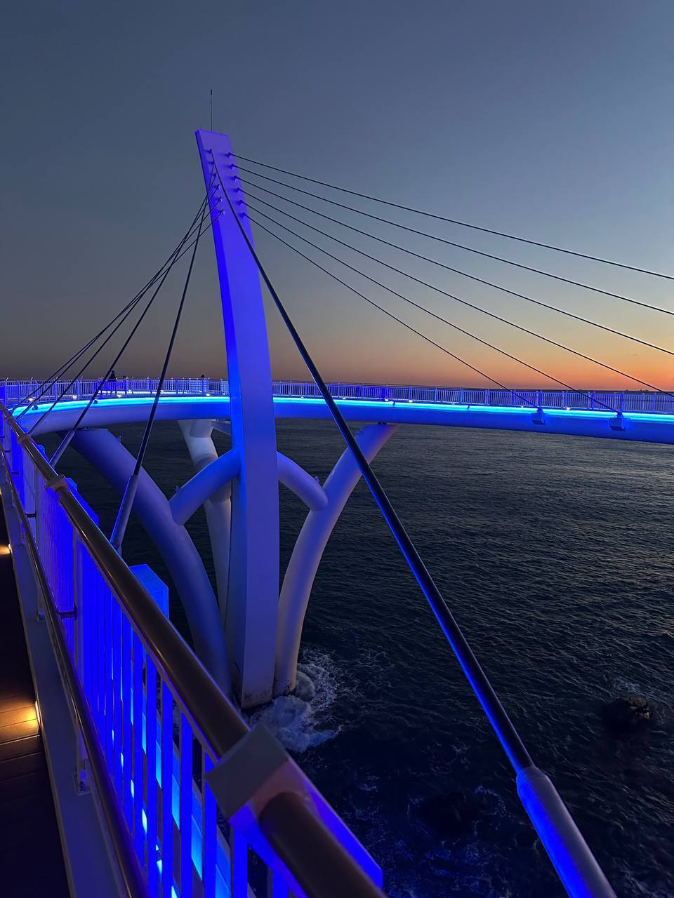 2) Тут есть мосты со стеклянными полом, чтоб с высоты смотреть на море и камни. Ночью тоже наверное ничего кроме заката не увидеть, но подсвечивается все шикарно.