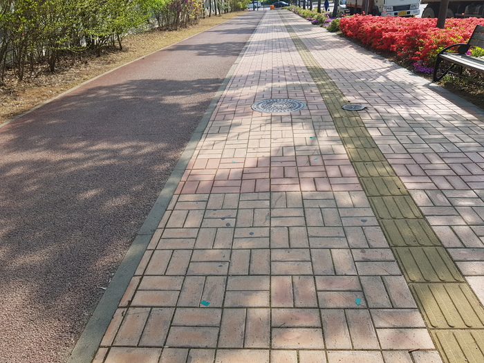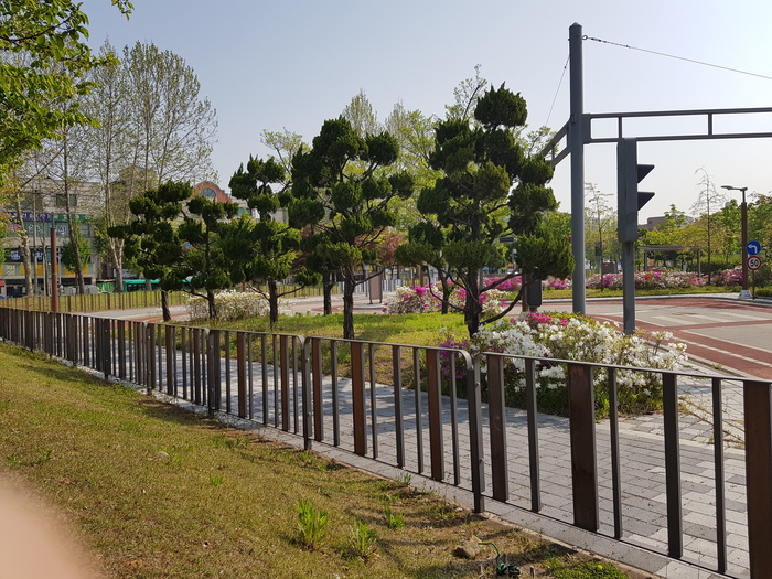 Это центральные улицы Ансана. Тут велодорожка, тротуар и плитка для слепых. Вдоль всей обочины растут сладкопахнущие кусты. Вот такие.