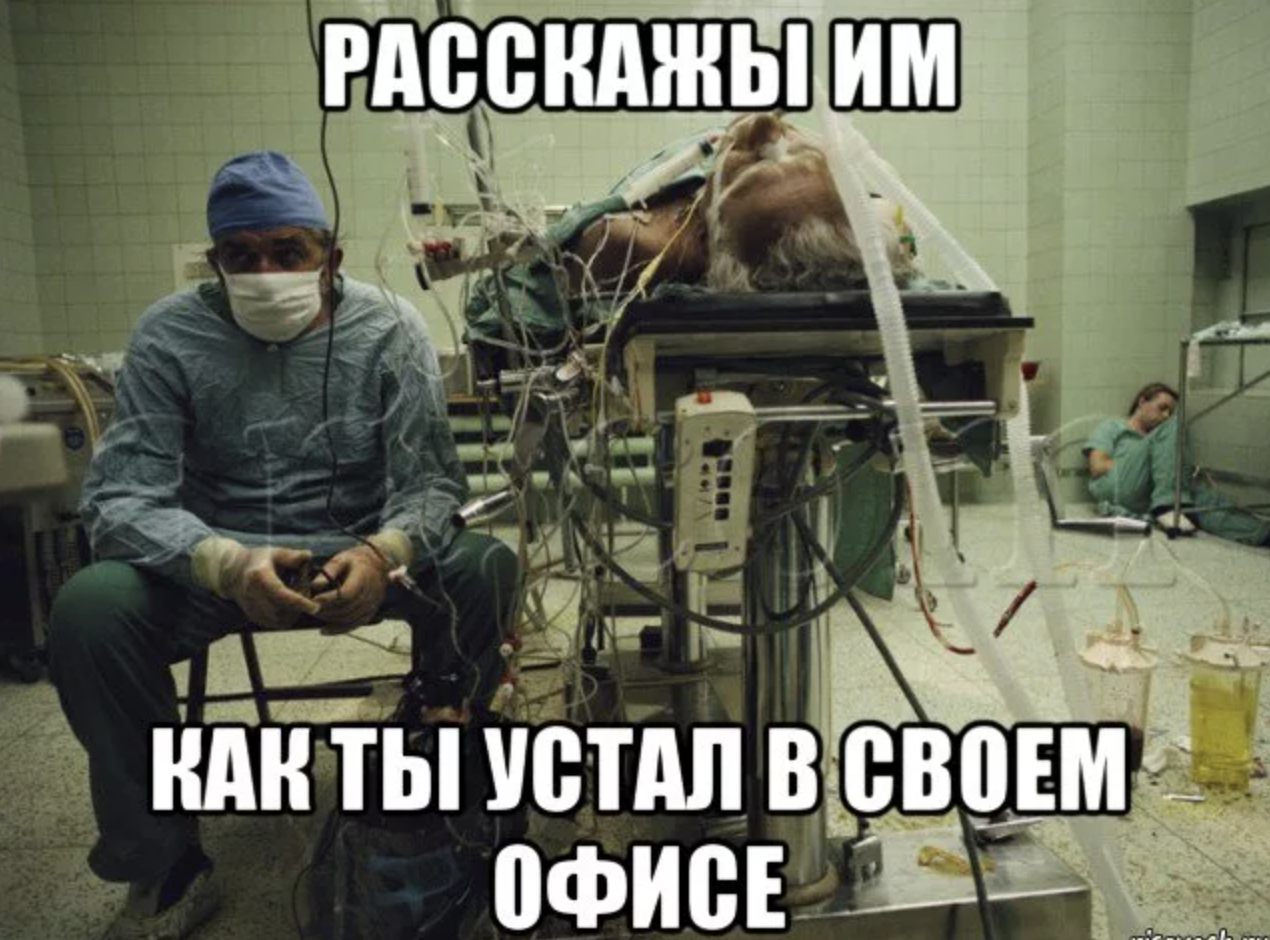 Еще раз респект врачам, хирургам и медсестрам (на картинке выше справа в углу еще медсестра спит у стеночки). В ИТ мы конечно тоже иногда сутками держим на себе Прод, но хирург держит конкретную жизнь на каждой операции, которую он видит лицом к лицу.