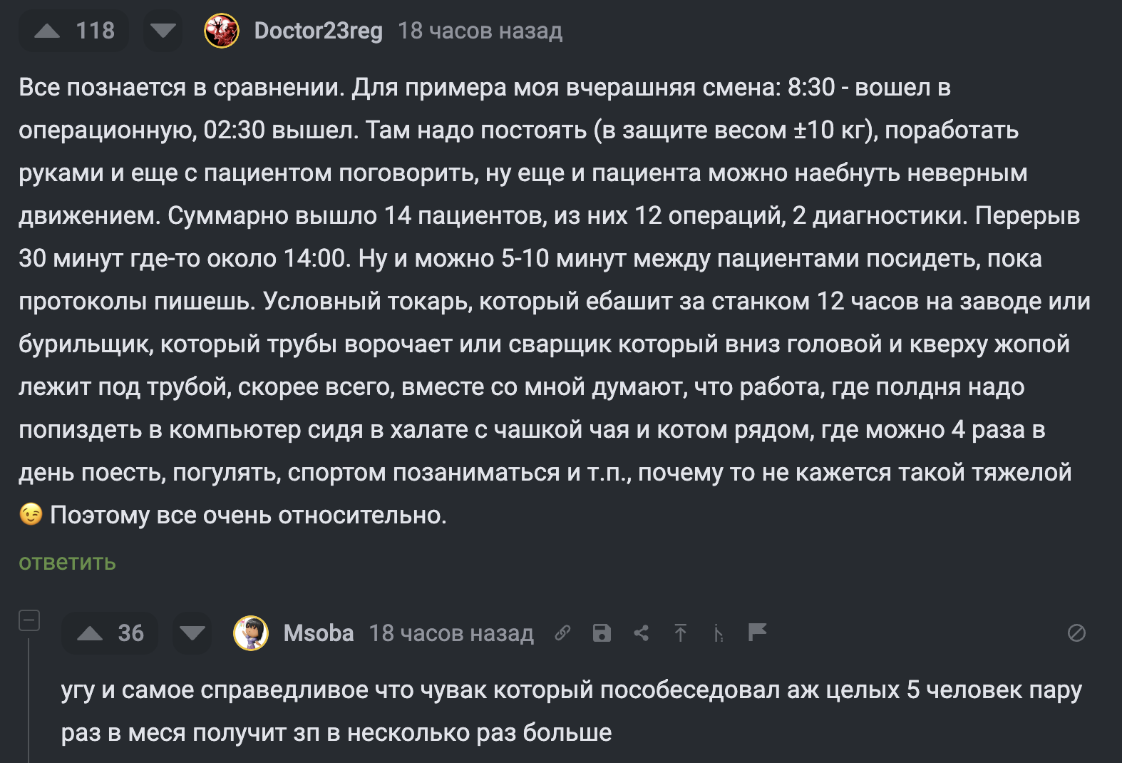 Та же история у кого нить таксиста, полицейского, шахтера, и т.д. Это все физически тяжелый труд, у него есть предел ваших возможностей. Плюс высокая цена ошибки - и врач и таксист и даже шахтер своими действиями может навредить или даже убить.