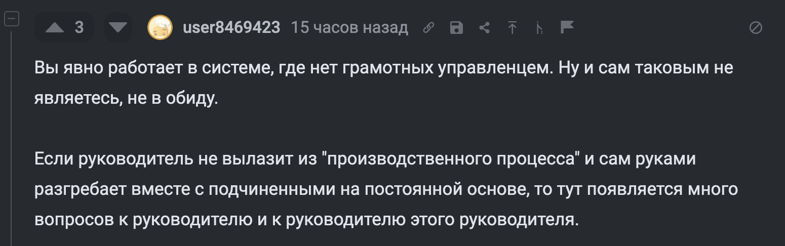 Тоже самое в ИТ. Если я нанимаю менеджера, и он сам фигачит не выходя из шахты, вместо