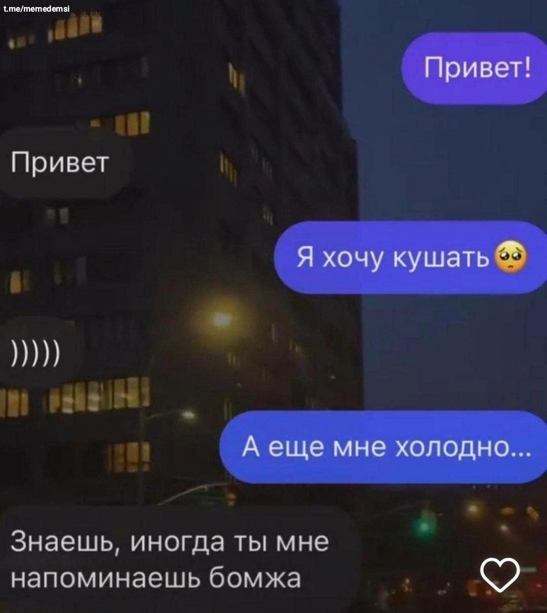 2069 kinosmotr Юмор для всех и каждого Юмор За словом в карман не полезет1 9 месяцев назад Канал MeMeDemsi Мемы Картинка с текстом Юмор Переписка Отношения Мальчики и девочки Бомж Telegram (ссылка) 67 5 3 1 1 Ещё 0
