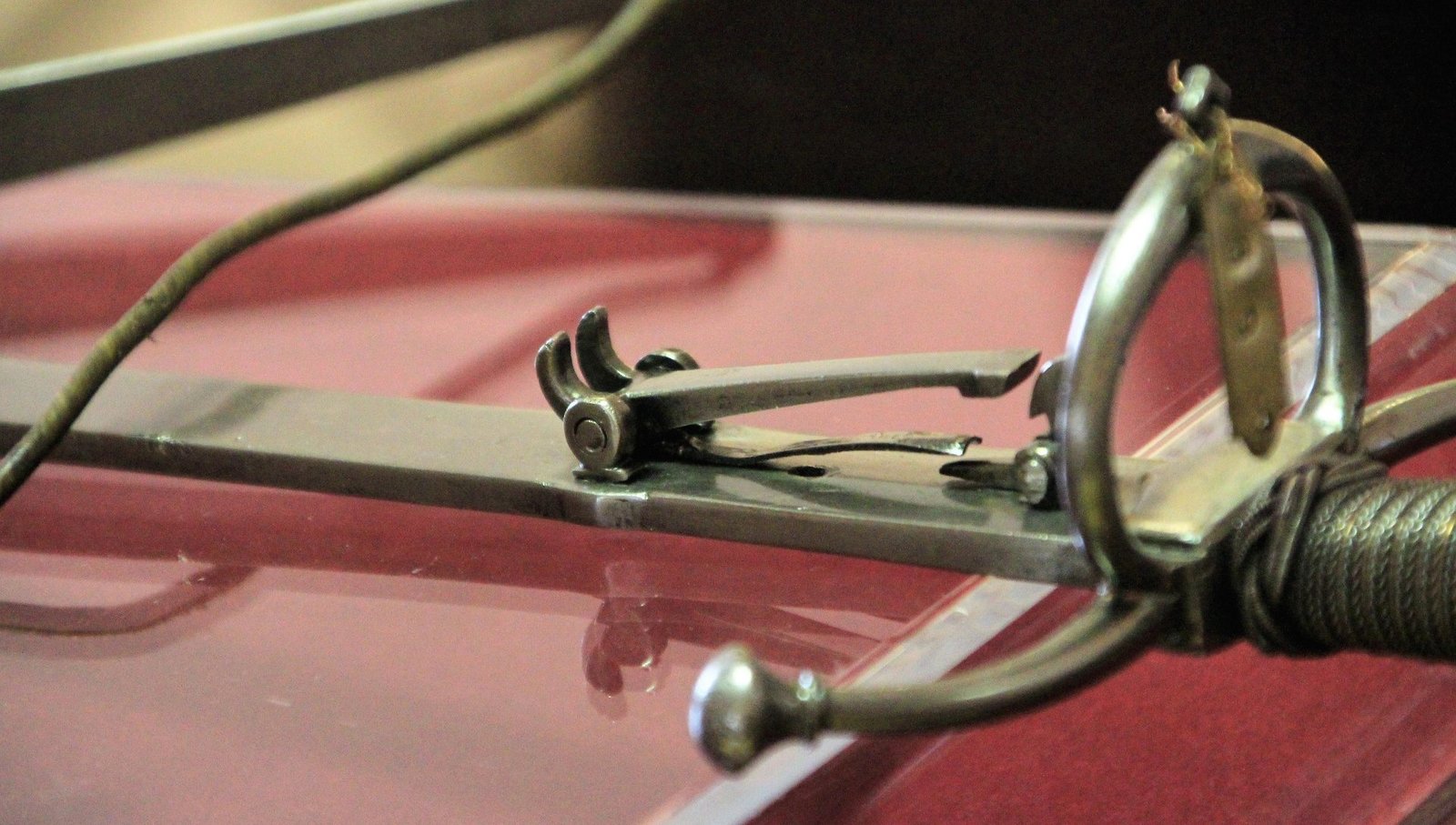 Жестяная бирка на кольце гарды - это музейный инвентарный номерок.