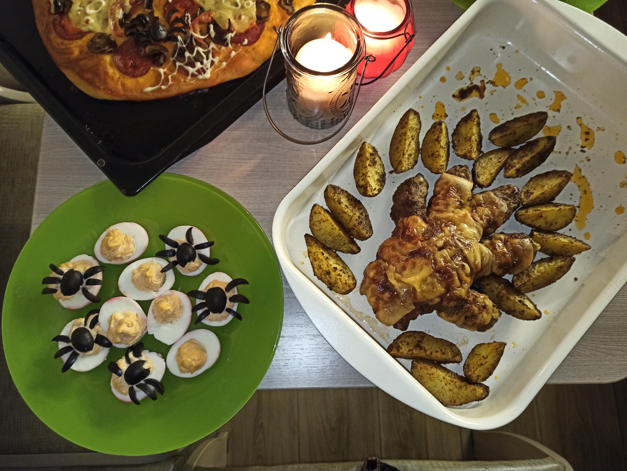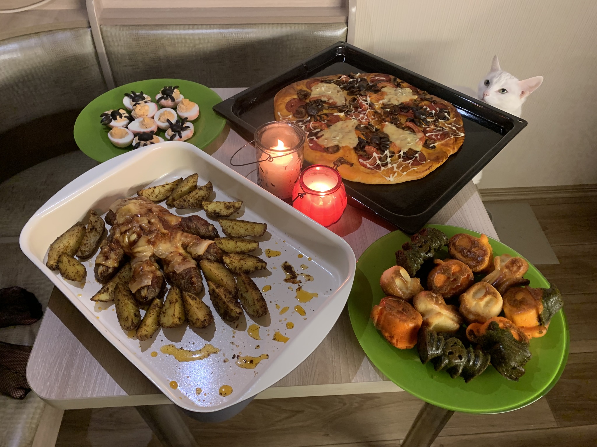Капелька предыстории: сама я не повар ни разу, готовила для души) Душе захотелось праздника, причём праздника тематического, а тут как раз он - Хэллоуин. Понимаю, что уже не успела с постом непосредственно к нему, но мало ли... На следующий год пригодится)) Фото в пост добавляю и готовых блюд и процесса, но не пошагово - т.к. в пост не влезем) Важно сказать, что рецепты и идеи конечно же подчерпнуты из интернетов - авторство у них не мое, я лишь транслирую тут свой опыт и некоторые наработки на этом поприще.