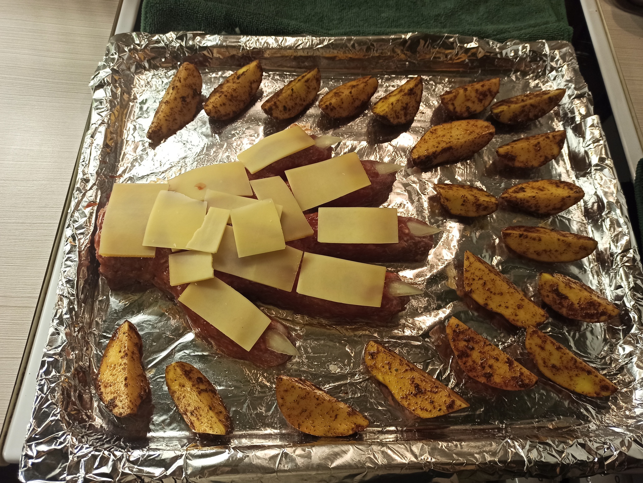 5. Ставим в духовку на температуру 180°, время - 1 час. Т.к. в моём случае гарниром был картофель, его я достала где-то через пол часа от начала приготовления.
