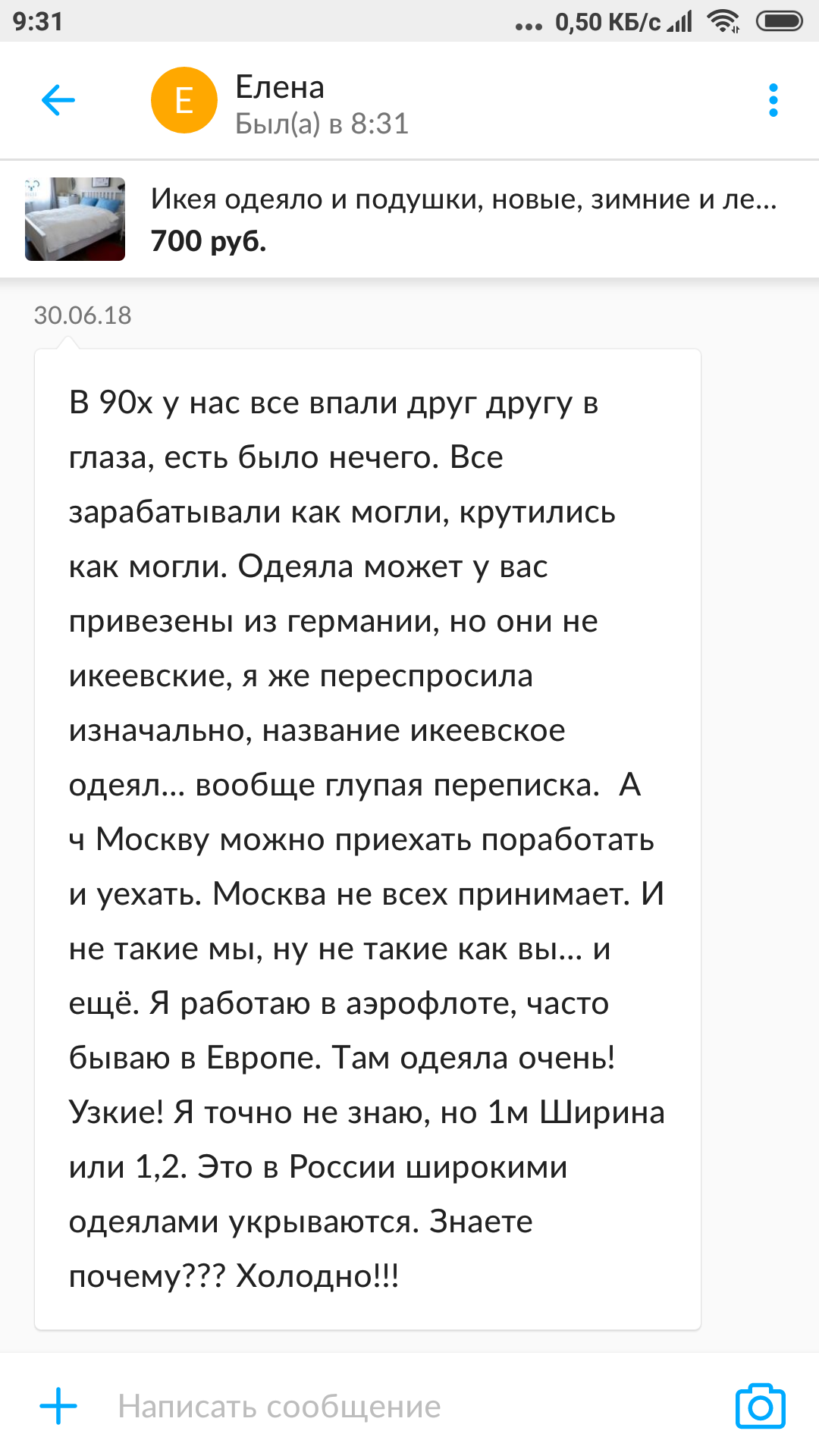 Не только к технике и не только чебуры, я торгую одеялами и подушками на юле и авито и не только, иногда поподаются очень смешные и не адекватные люди, недавно москвичка писала которая стала мне зачем-то рассказывать что в Калининграде как в 90-х все, не то что в Москве, пыталась убедить меня что мой товар из Китая, и то что это каждый ребёнок знает, в итоге она стала говорить что часто бывает в Европе... Сейчас скрин прикреплю. В конце она сказала что одеяла в России шири потому что холодно, открыла мне глаза можно сказать, чем шире одеяло тем теплее я то думал чем толще тем теплее.