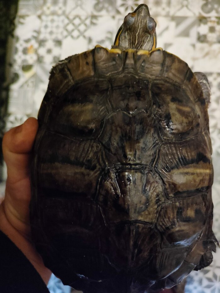 Аквариум - сорок литров, с бережком, уф лампа, фильтр, обогреватель и лампа обогрева есть. Корм - Tetra ReptoMin, иногда даём морковку лист салата и яблоки. Фото моей черепахи - не сильно удачное, но она(он?) не любит фотографироваться. И в руку уже не влазит.