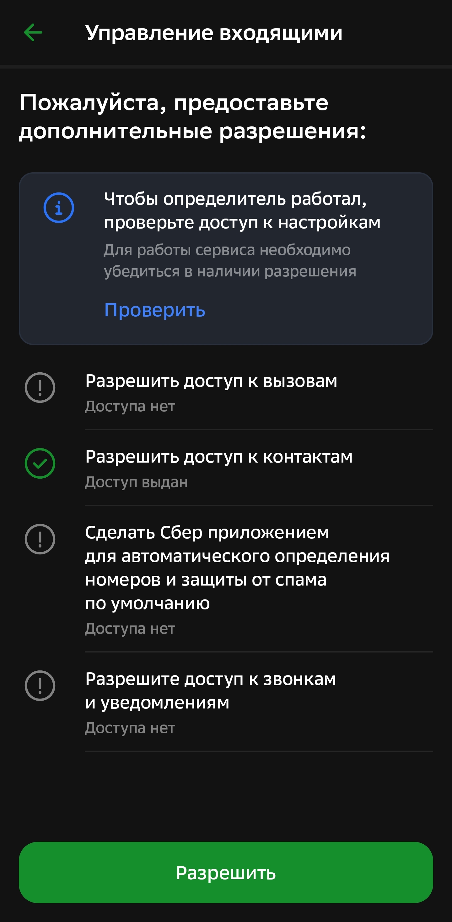 Что ж, хочется доверить свою безопасность сберу, но из скрина выше видно, что проверка входящих звонков не включена, надо срочно включать!