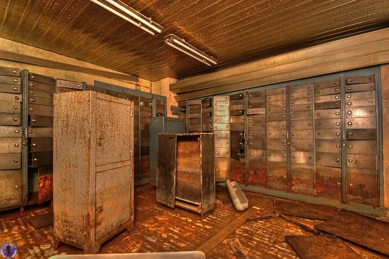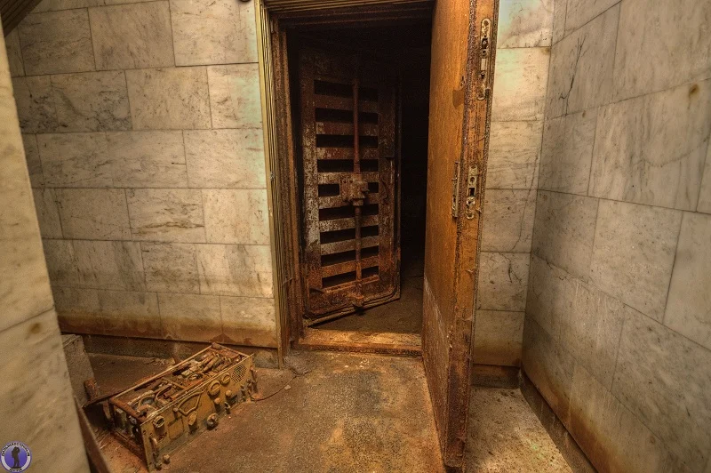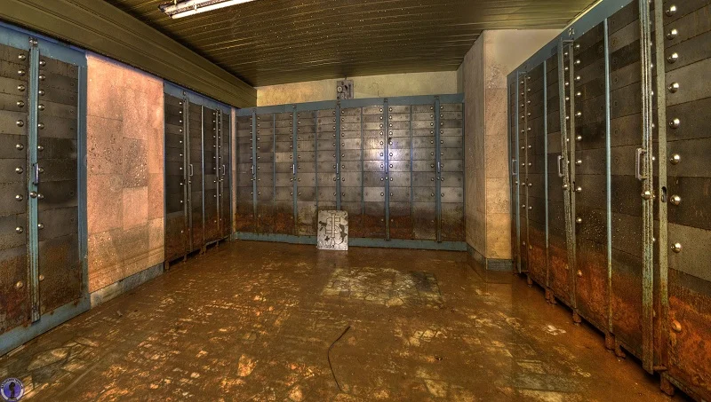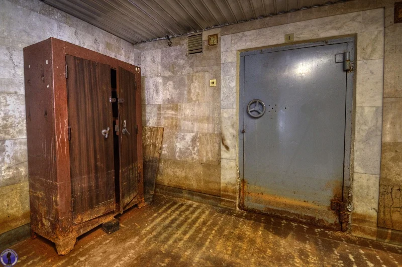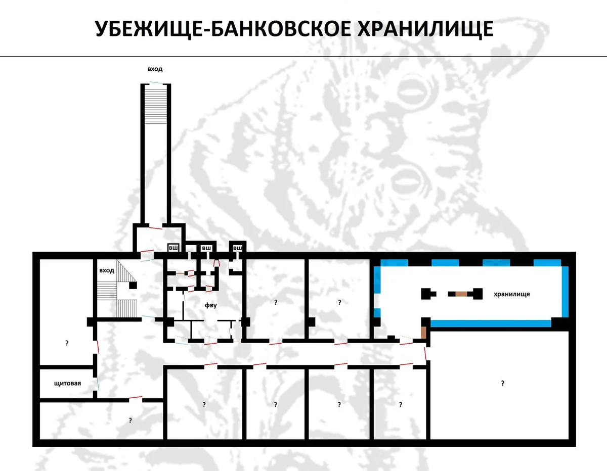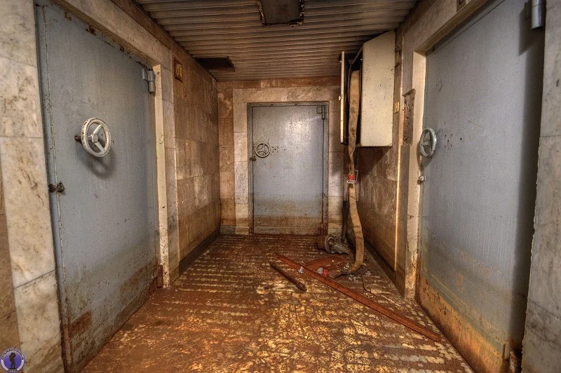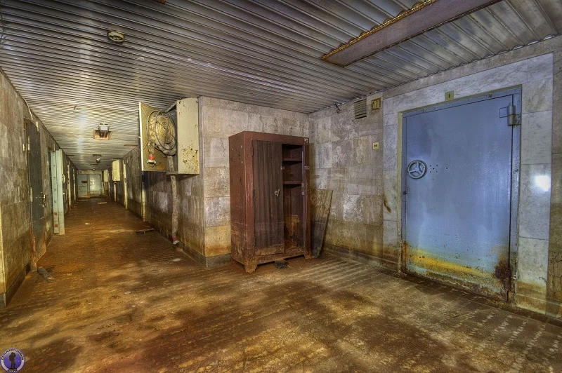 Очень интересное и одно из немногих (если не единственное) доступных в стране заброшенных убежищ, в которых размещались банковские хранилища. К сожалению схемка очень примерная т.к. до сих пор большинство сейфовых дверей в помещения закрыты намертво и годами сдерживают напор желающих заглянуть за них.