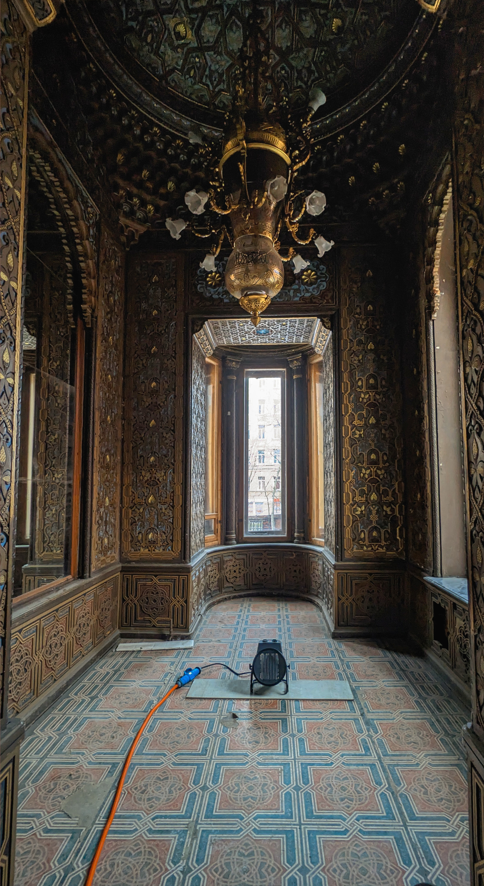 Так как особняк отключен от отопления, в каждом зале установлены электрические обогреватели и штативы с освещением. Представьте, сколько энергии это всё потребляет? Значит за особняком всё-таки приглядывают. Заботятся о лепнине, которая при сильной влажности и перепадах температуры начнет отваливаться. Как могут, оберегают подлинную раритетную деревянную мебель, но сильно страдает обивка кресел и скамеек.
