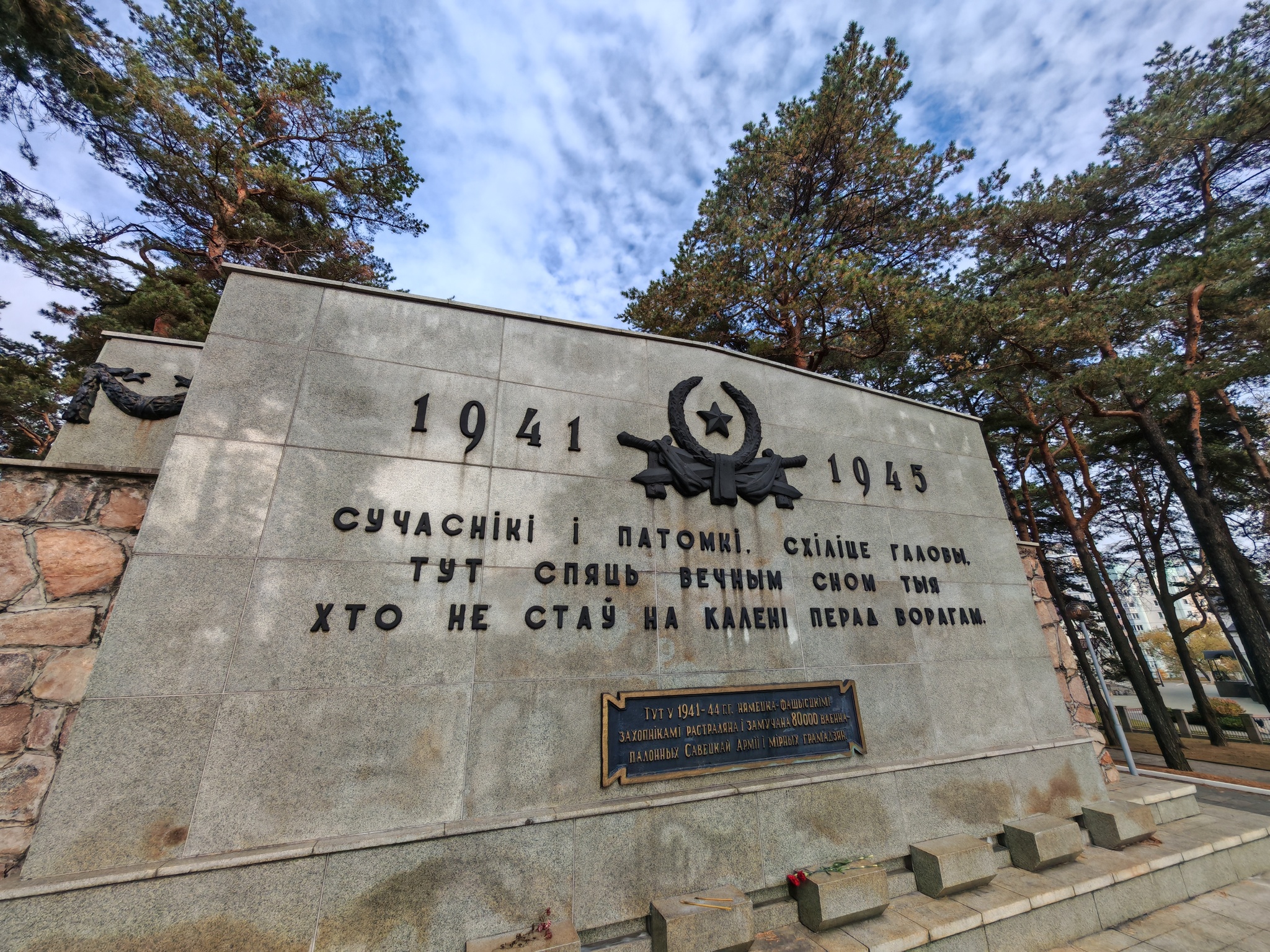 Надпись на белорусском: "Современники и потомки, склоните головы. Тут спят вечным сном те, кто не встал на колени перед врагом. Тут в 1941-1944 немецко-фашистскими захватчиками расстрелено и замучено 80 000 военнопленных советской армии и мирных граждан.