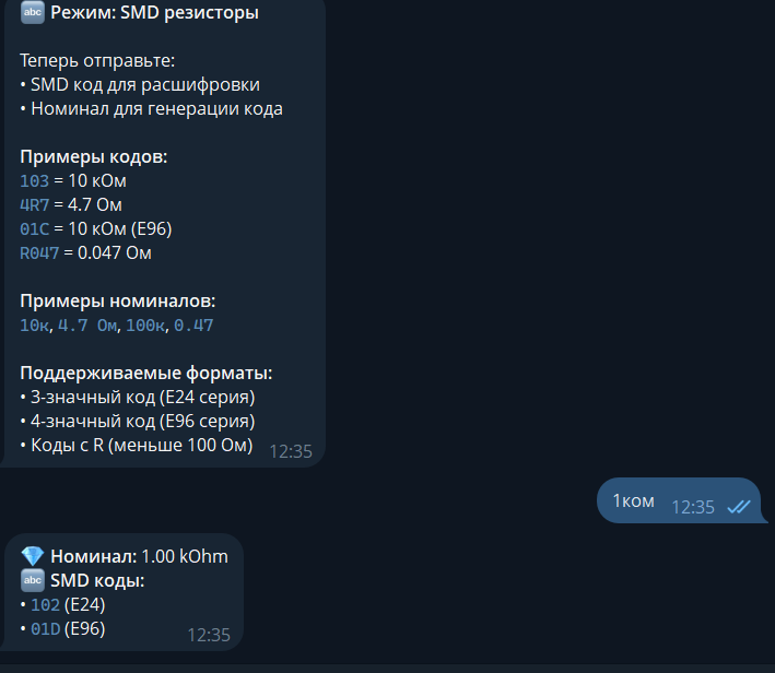 Бот: "SMD код: 102 | Номинал: 1.00 кОм | Тип: E24"