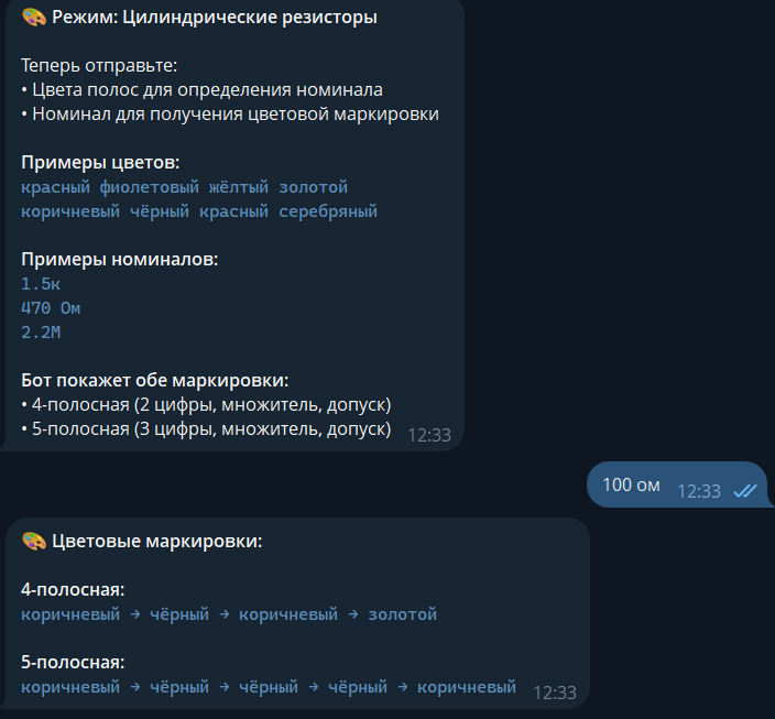 Показывает цветовую маркировку по номиналу → вводите "470 Ом" и бот показывает обе маркировки (4-полосную и 5-полосную)