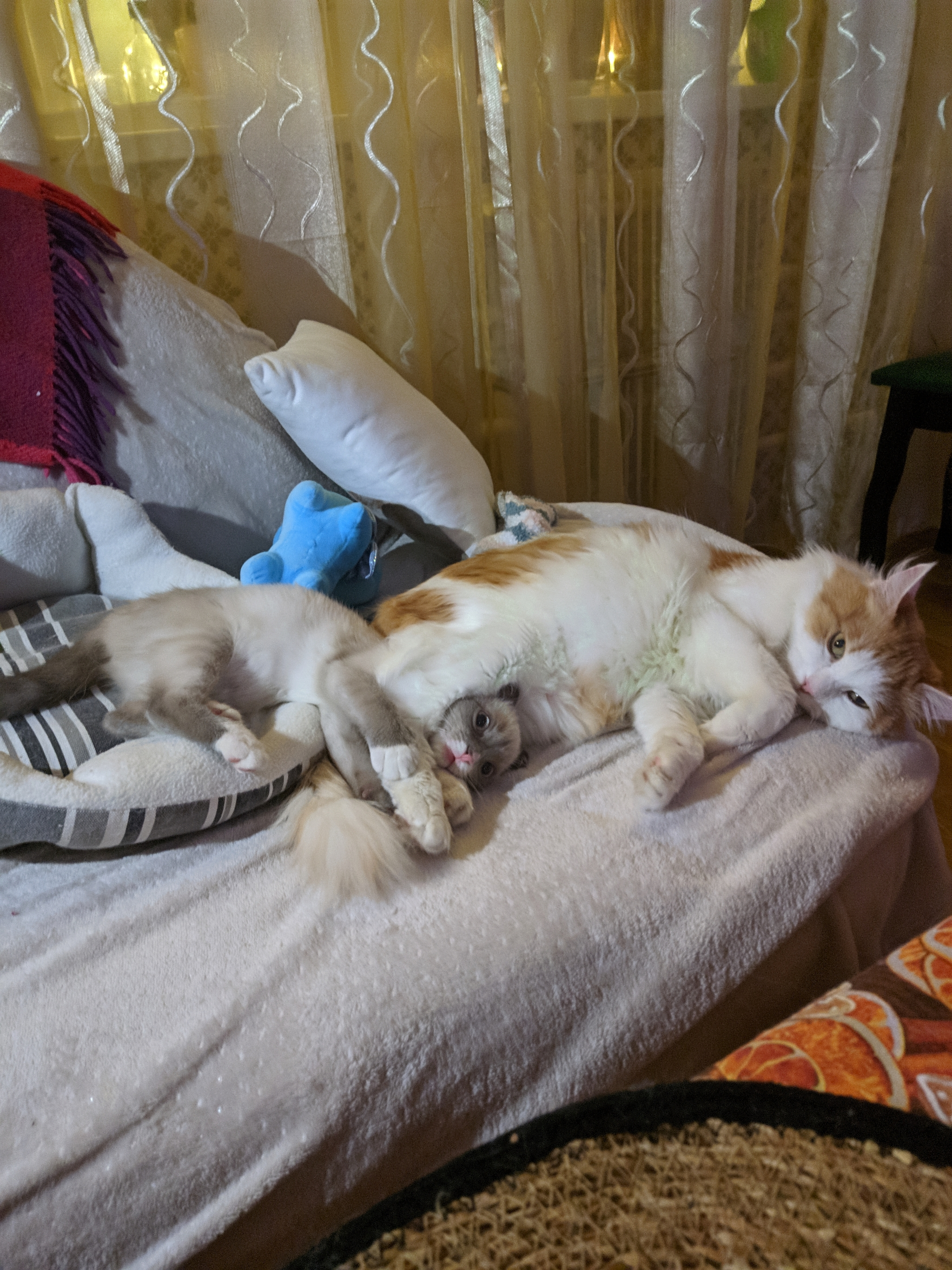 Возвращаемся домой после бесчинства ужина в ресторане в кругу друзей и родителей около 01:00, все хорошо. Спокойно спит на кровати, заняла место посередине, в подушках.