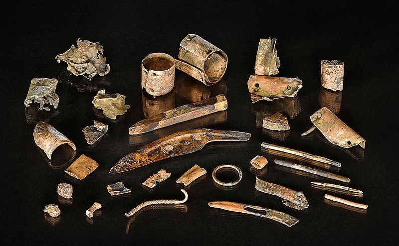 Что из этого следует? А то, что вещи нападавших и их оружие тщательно собрали победители. Никаких драгоценностей или сколько-нибудь ценных украшений не найдено, лишь одно маленькое кольцо из спиральной золотой проволоки, а так же подобные ему бронзовые и оловянные кольца. Скорее всего, это даже не украшения, а, своего рода, деньги для обмена и покупок – жалкие остатки добычи, которую не нашли мародеры. По мнению археологов, после обыска трупы кидали в реку, где их выносило на мель со слабым течением или в тихую заводь у берега, что и объясняет столь высокую концентрацию костей в одном из мест.