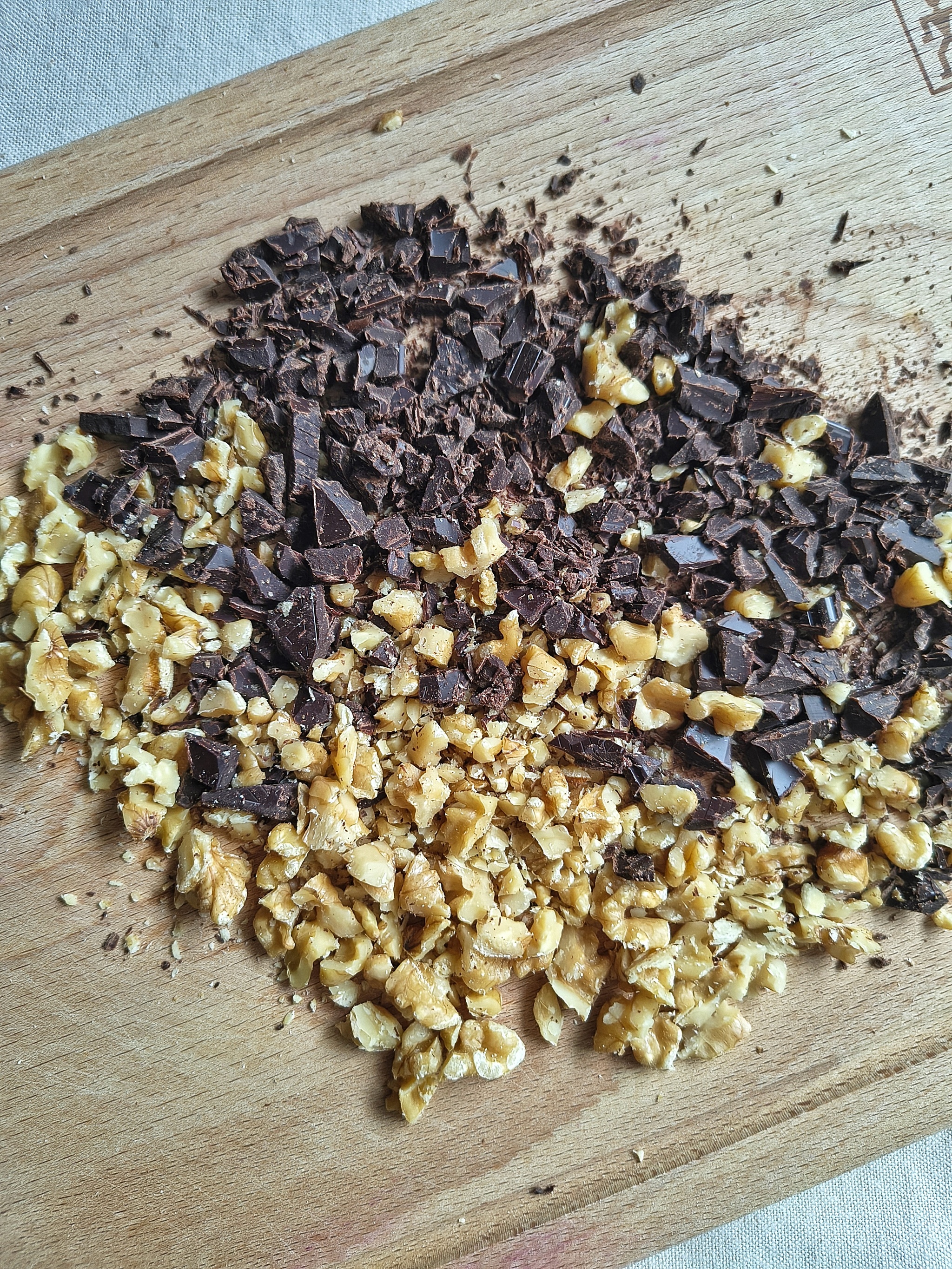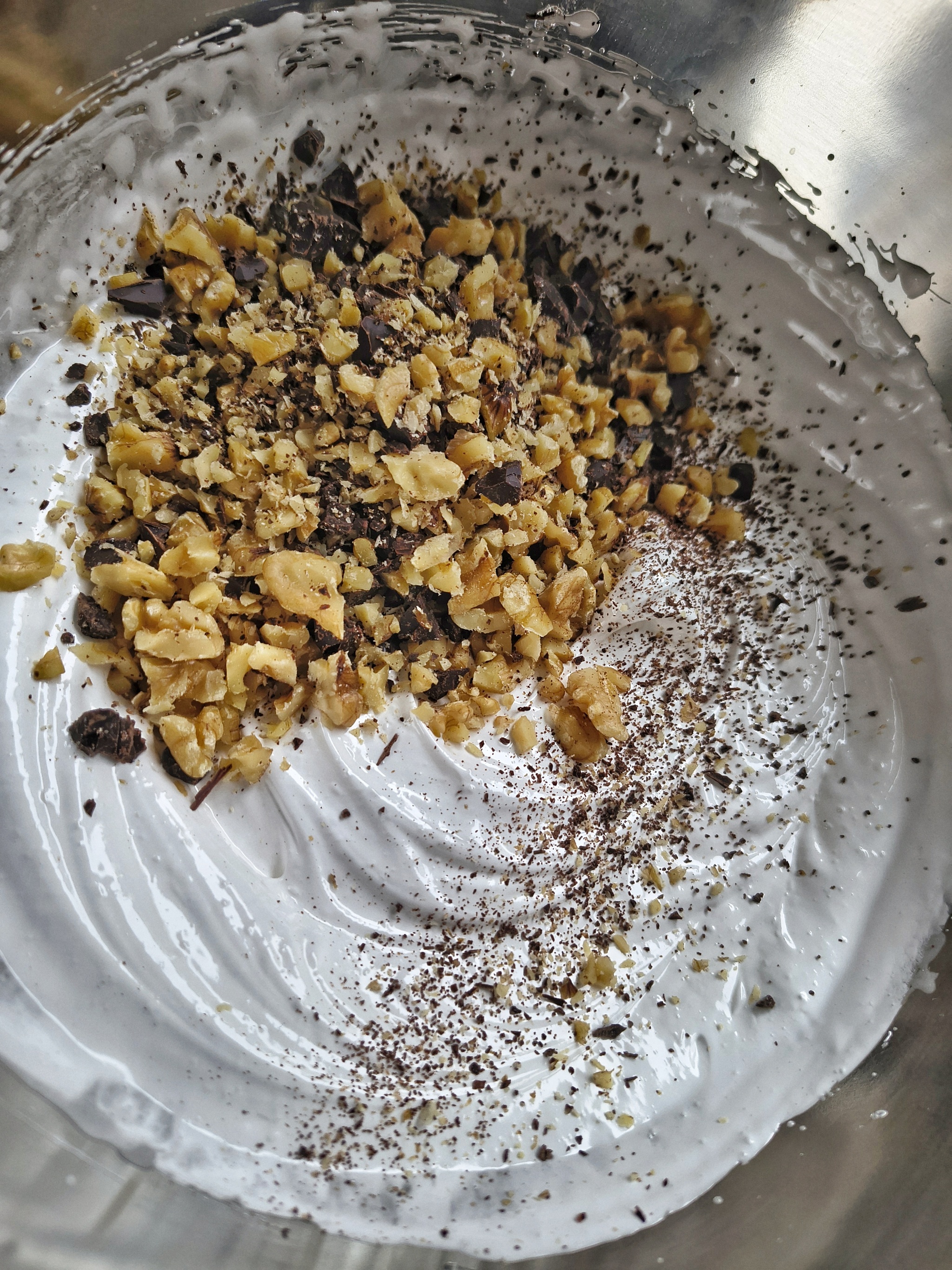 – Добавьте в крем мелко порубленные орехи и шоколад, перемешайте