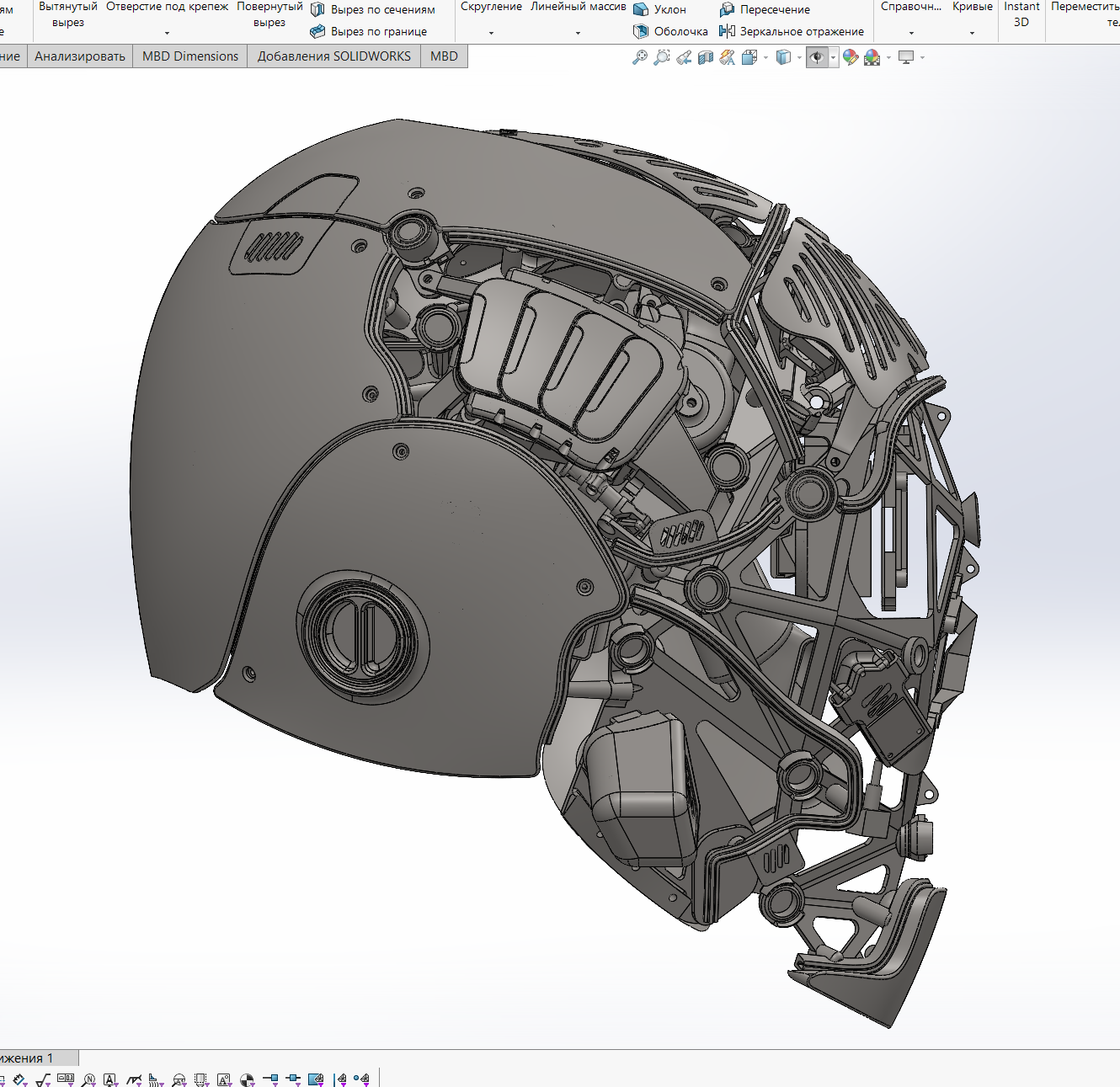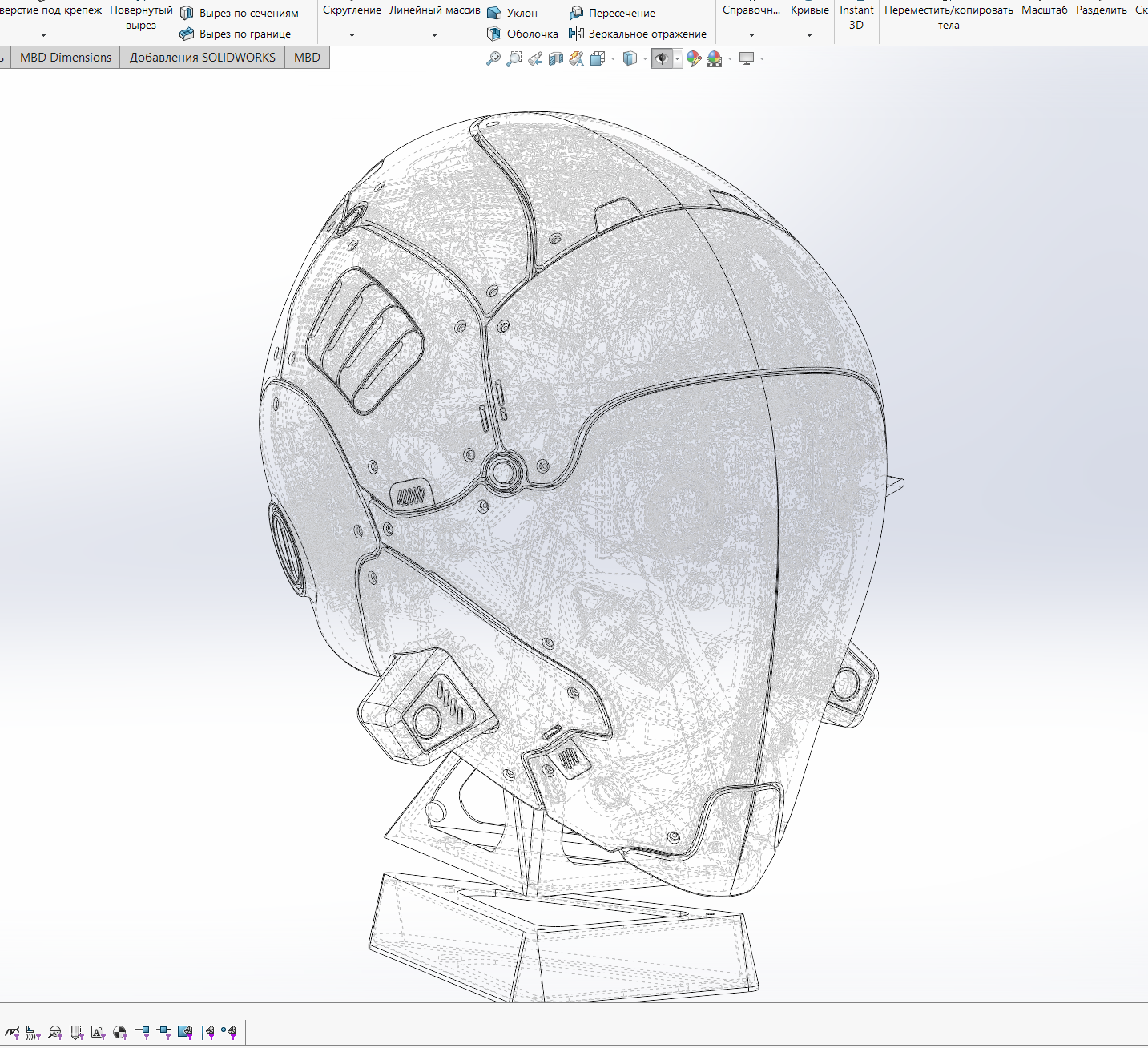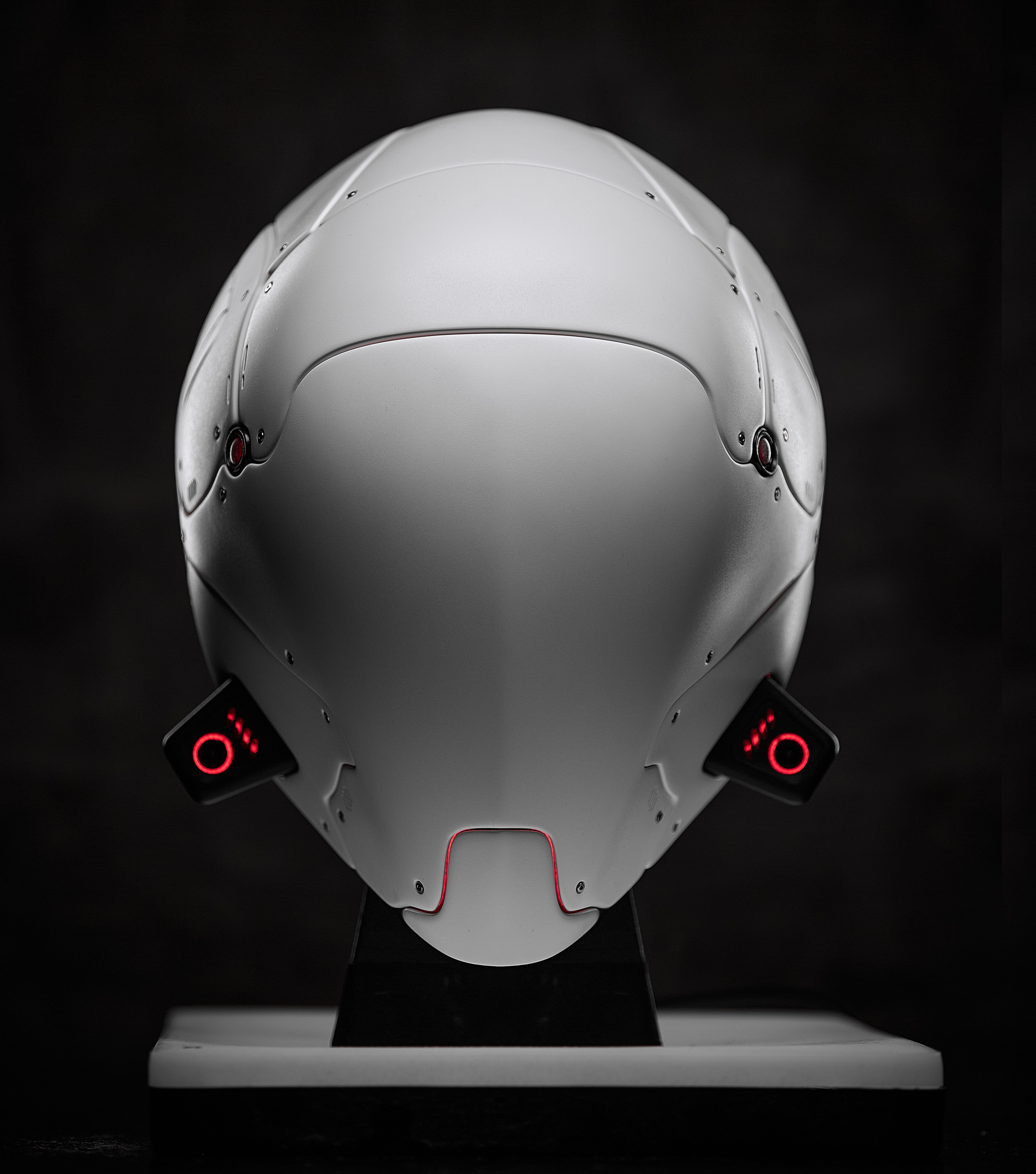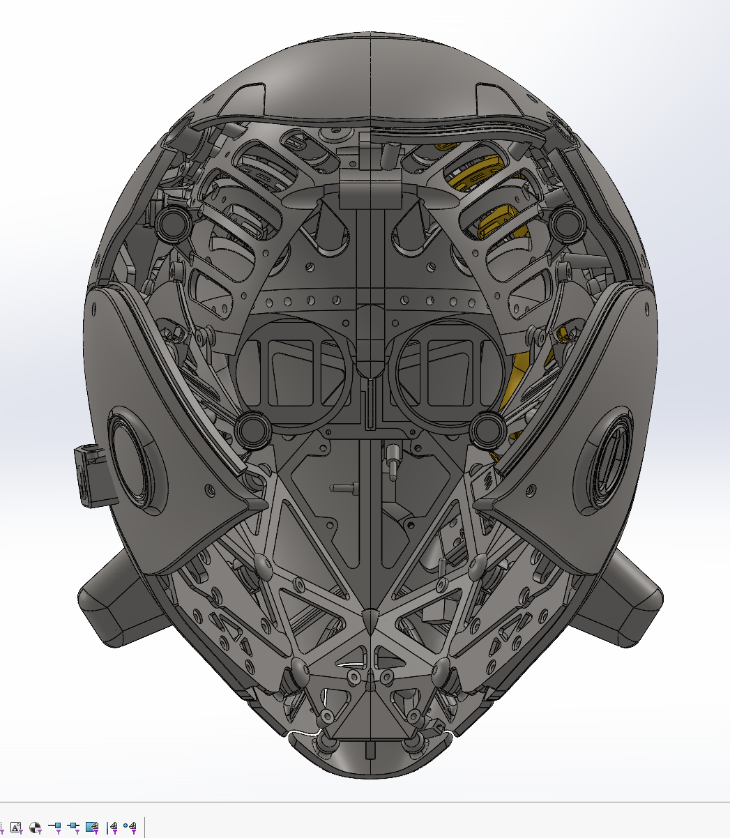 Поэтому на досуге спроектировал и реализовал шлем "без глаз", с двумя камерами для стереозрения, внутри экраны чтобы смотреть, вентиляция, маленький экранчик, показывающий режимы вентиляции. Заслоночки двигаются при включении вентиляторов, швы подсвечиваются в разных режимах. Панели съёмные на магнитах, снимаются с некоторым усилием, но сами не болтаются и не отваливаются, как башкой ни тряси. Управляется всё это крутилкой и тремя переключашками, внутри стоит ардуина, раздающая команды. Основная структура напечатана из CF-поликарбоната, механизмы и вообще мелкие детали - смола. Для светящихся элементов красная прозрачная, для всех остальных просто белая. Покрашено тупо из баллончика.