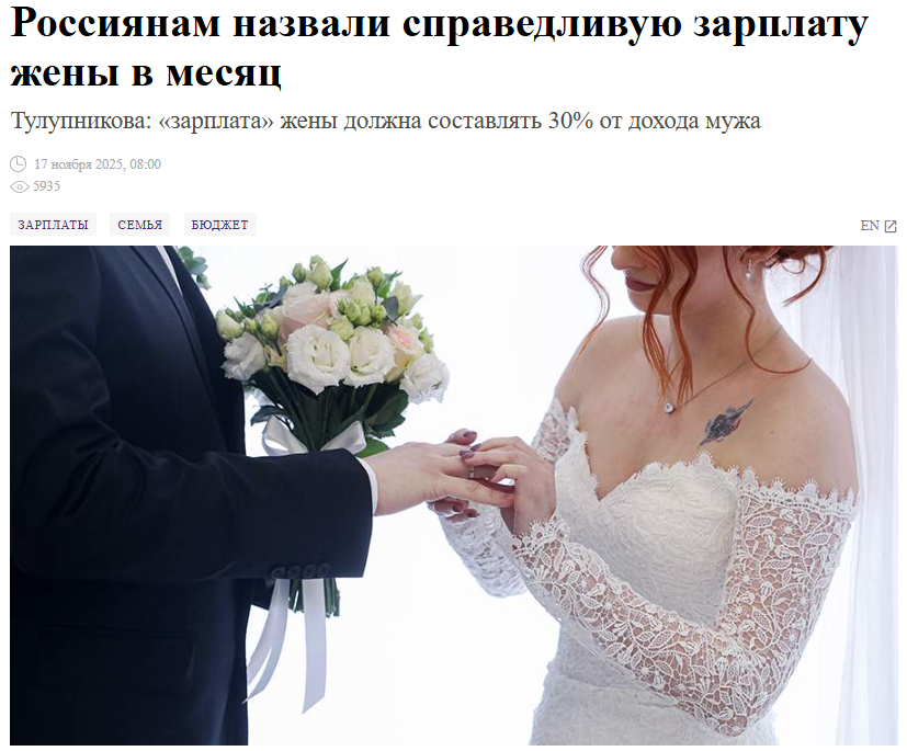 Новости: Россиянам назвали справедливую зарплату жены в месяц | Новости общества | Известия | 17.11.2025, В РФ призвали сделать обязательной "зарплату жены" за домашний труд - Новости на Вести.ru, Эксперт Сазанова: труд женщины-домохозяйки экономит семье 100 тыс. рублей | Аргументы и Факты