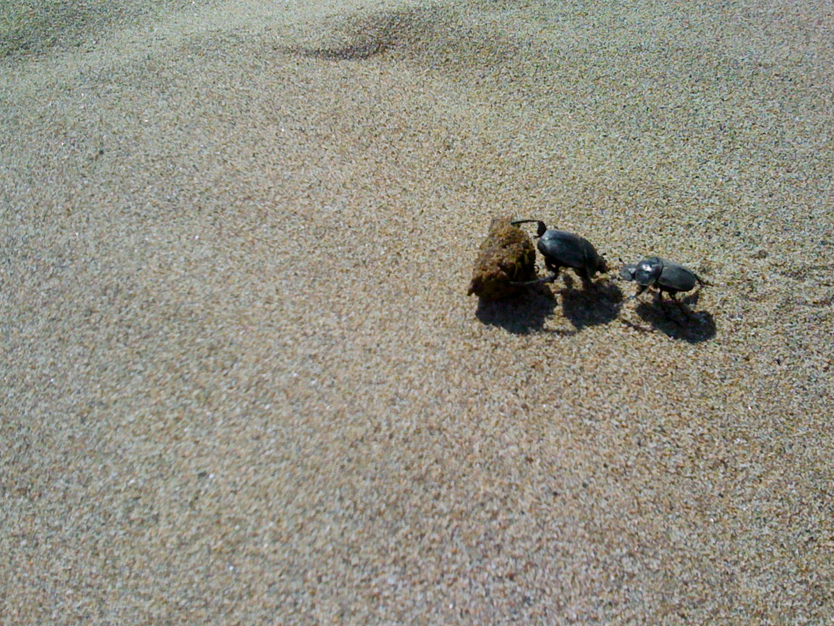 Почему он так спешит? Конкуренты могут строить козни! Другие жуки не дремлют и всегда готовы отнять чужой, уже готовый шар. Это называется клептопаразитизм. Обратный путь, кстати, прокладывается с ориентацией на звёздное небо... Это не просто красивая фраза. Учёные доказали, что жуки-скарабеи и некоторые навозники ориентируются по свету Млечного Пути!