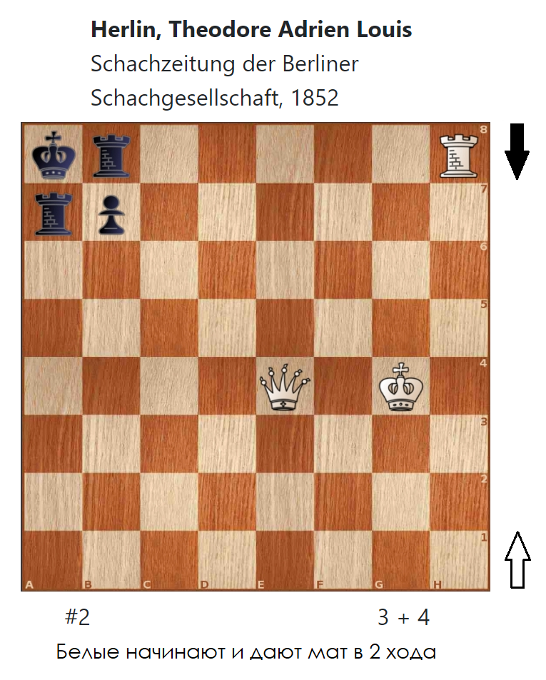И снова простенькая двухходовая миниатюра для неопытных любителей шахматных задач на этот раз от французского шахматного композитора Теодора Адриана Луи Эрлена (Théodore Adrien Louis Herlin, 1817 - 1889), опубликованной в газете берлинского шахматного сообщества "Schachzeitung der Berliner Schachgesellschaft" в 1852 году.