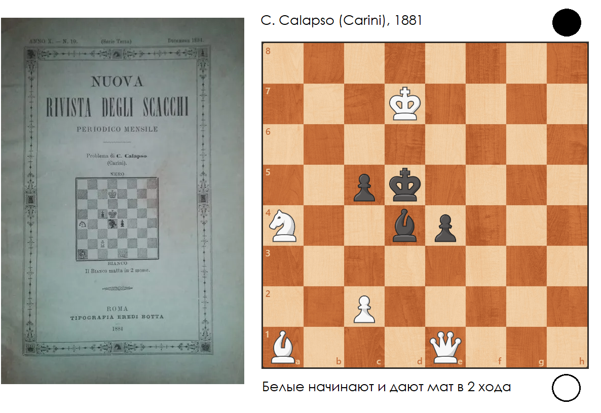 Композиция сицилийца Calapso с заглавной страницы итальянского ежемесячного шахматного журнала "Nuova Rivista degli Scacchi" за декабрь 1881 года, думаю, подойдёт для решения не очень опытным любителям шахматных задач. В этом положении белым предлагается поставить мат чёрному королю за два хода.