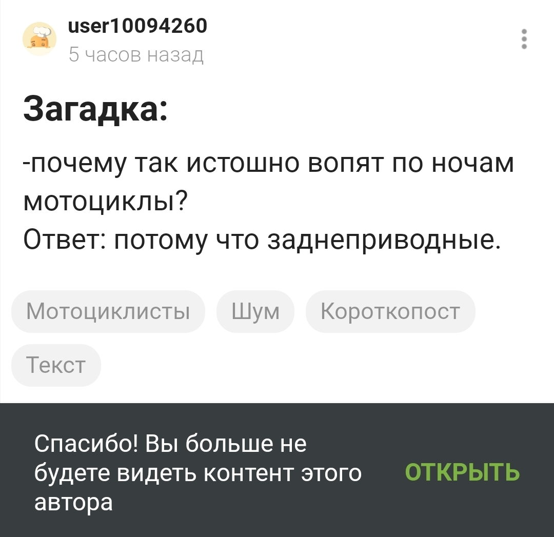 1 user10094260 Загадка: 5 месяцев назад -почему так истошно вопят по ночам мотоциклы?Ответ: потому что заднеприводные. Мотоциклисты Шум Короткопост Текст 1 Ещё 0