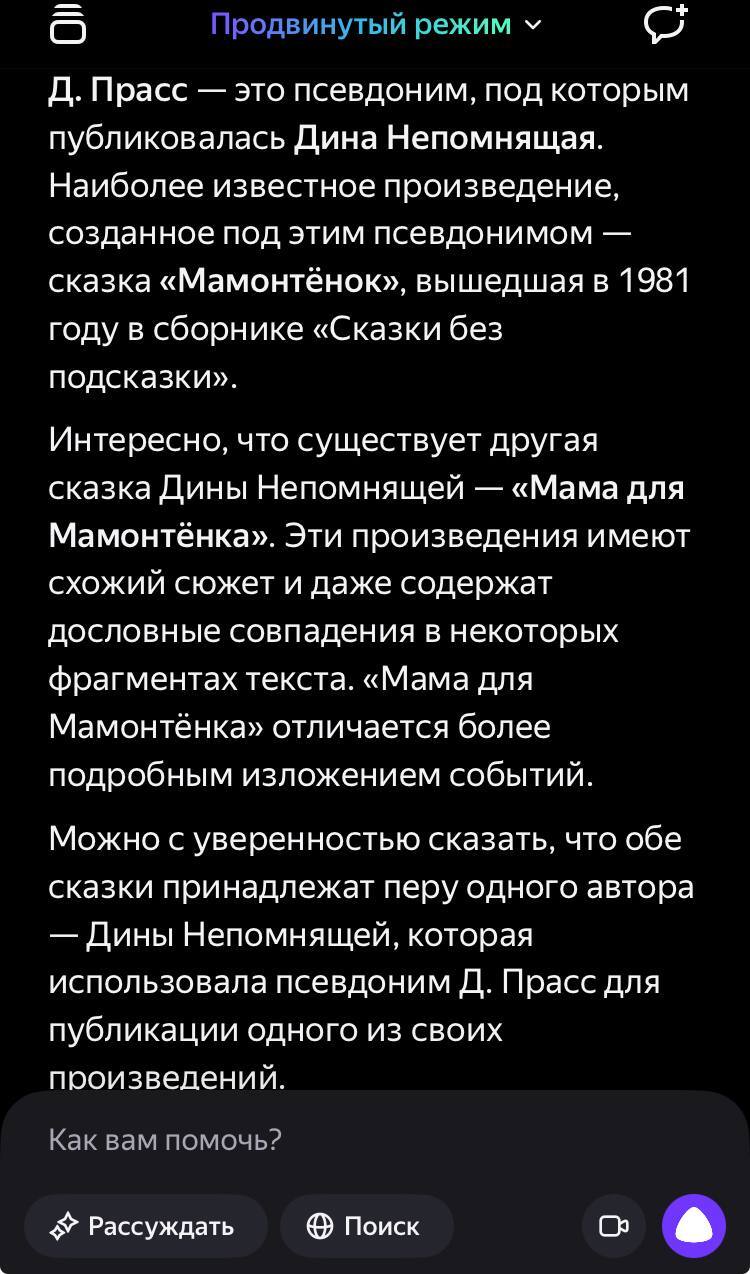 Интрига раскрылась недавно. Оказалось, что загадочный Д. Прасс, отправивший мамонтёнка в зоопарк,-это и есть Дина Непомнящая. Под этим псевдонимом её первоначальная версия рассказа о мамонтёнке была опубликована в сборнике сказок "Сказки без подсказки" в 1981 году.